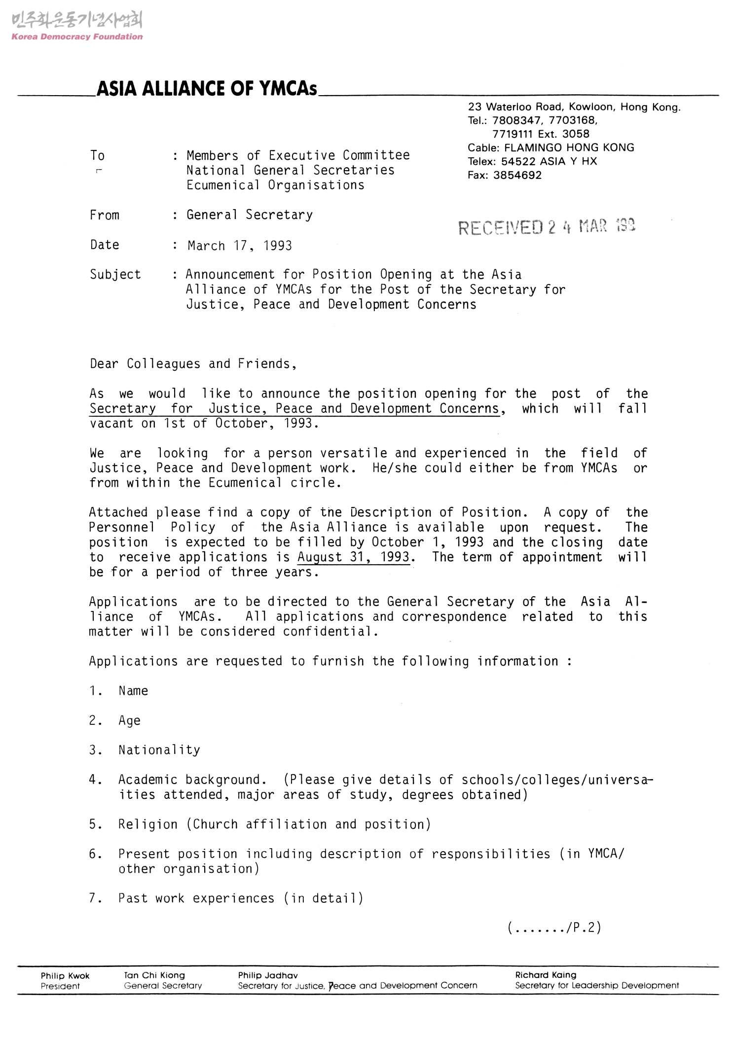 Announcement for Position Opening at the Asia Alliance of YMCAs for the Post of the Secretary for Justice, Peace and Development Councerns