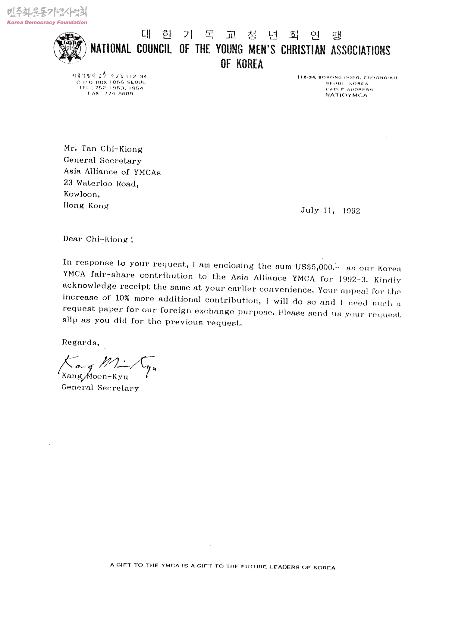 [Korea YMCA fair-share contribution][수신:Mr. Tan Chi-Kiong General Secretary Asia Alliance of YMCAs,발신:Kang Moon-Kyu General Secetary]