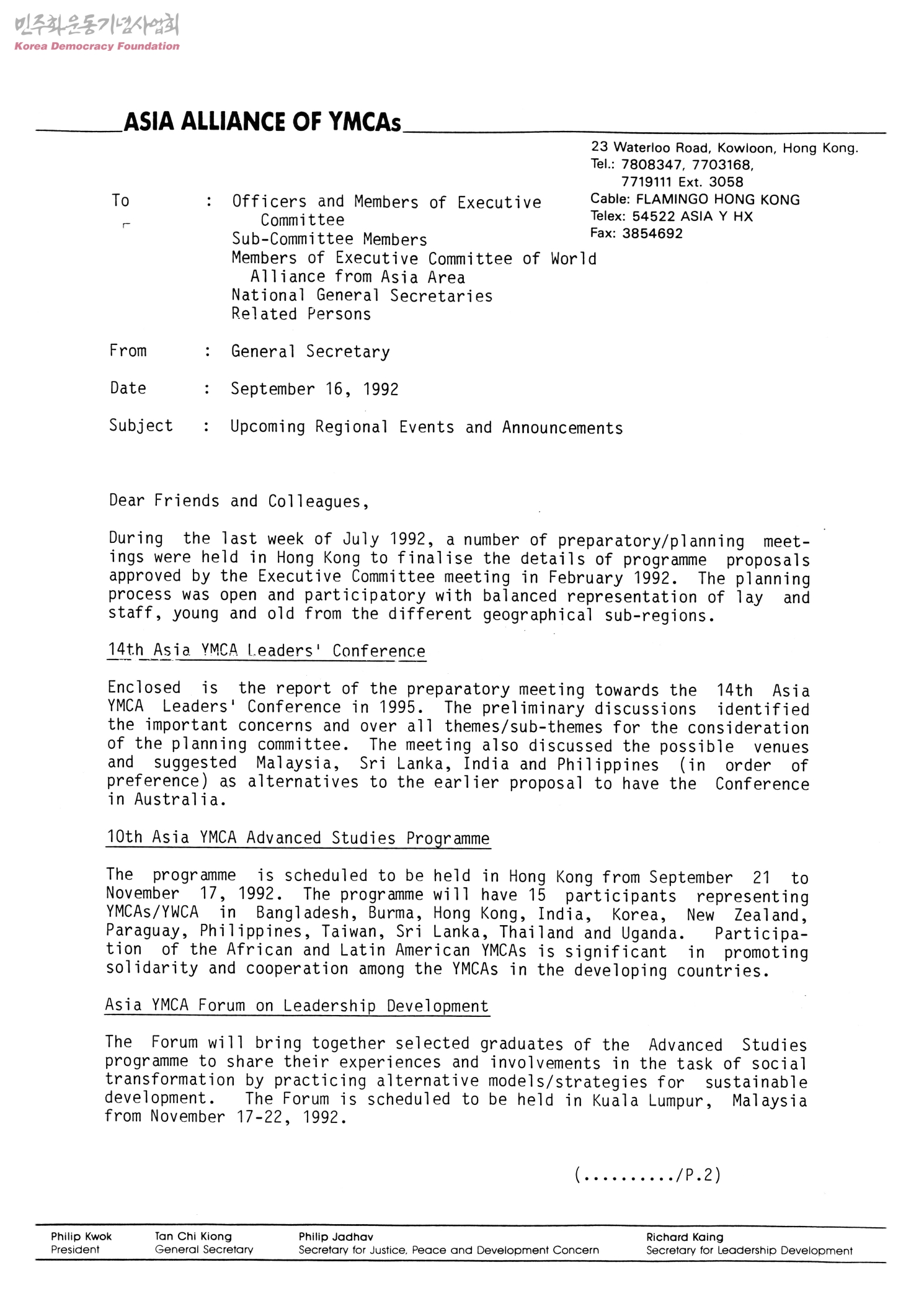 - 첨부-Report of the Preparatory Meeting 14th Asia-YMCA Leaders' Conference held in Hong Kong from July 24-25, 1992.