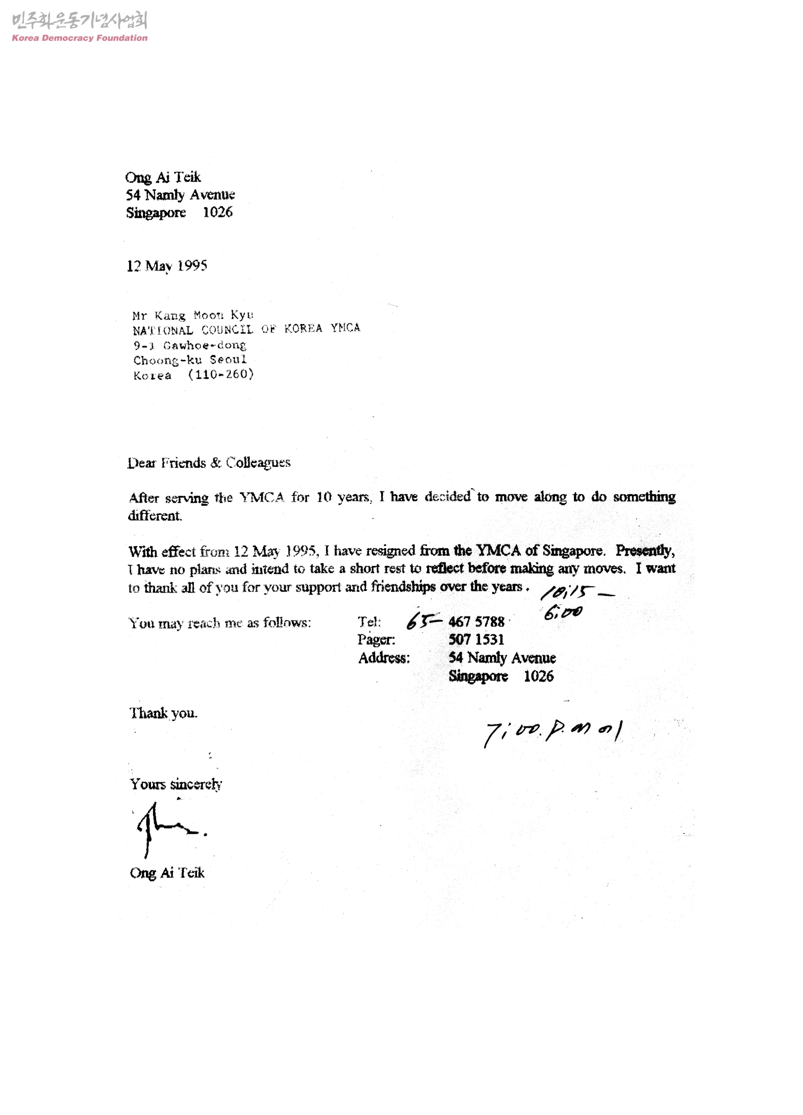 [YMCA 사임 및 감사][수신:Mr. Kang Moon Kyu NATIONAL COUNCIL OF KOREA YMCA,발신:Ong Ai Teik]