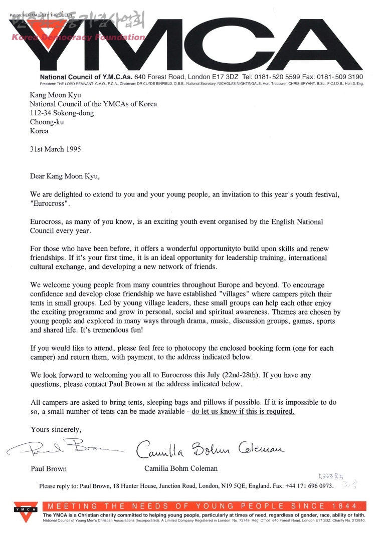 ["Eurocross" 참석 안내문][수신:Kang Moon Kyu National Council of the YMCAs of Korea,발신:Paul Brown 외]