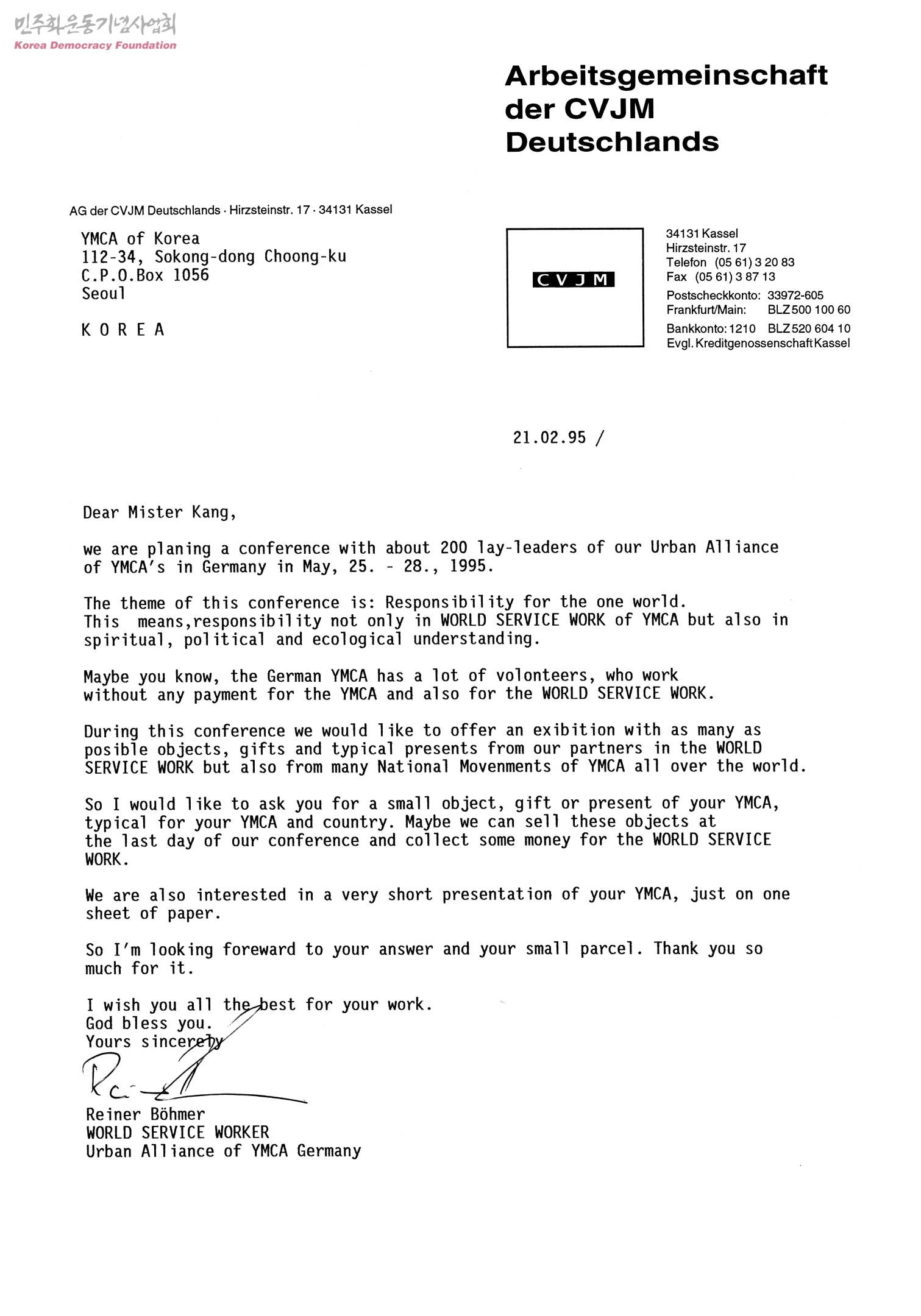 ["Responsibility for the one world" conference에 대한 안내문 및 요청문][수신:Mister Kang, YMCA of Korea,발신:Reiner Bohmer WORLD SERVICE WORKER Urban Alliance of YMCA Germany]