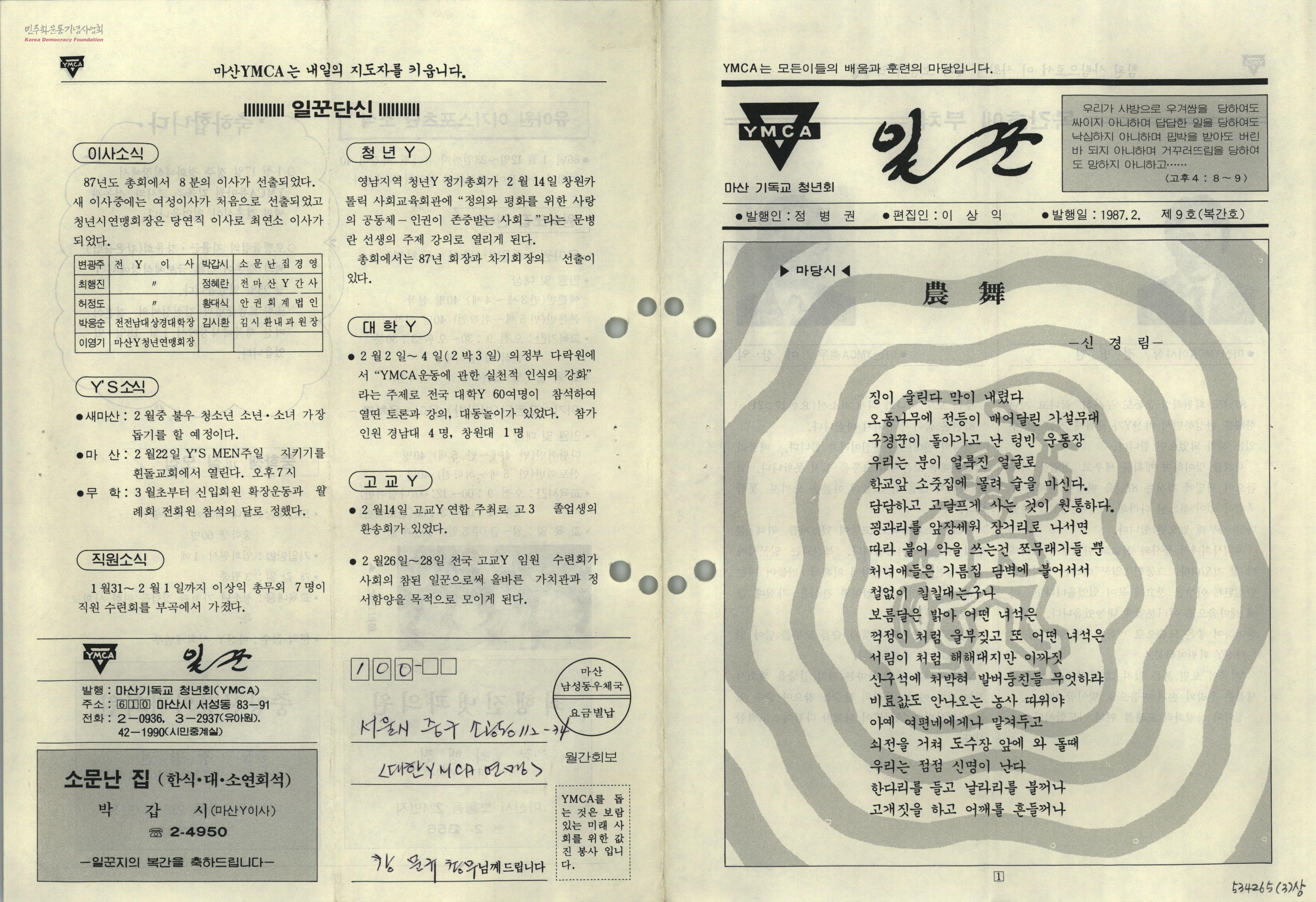 - 마당시-農舞 / 신경림 복간호에 부쳐 / 정병권(마산 YMCA이사장),이상익(마산YMCA총무) 공동체문화-마당극에서 마당굿으로 시민중계실 개설에 부쳐 일꾼들의 이야기(조환국,경남대Y) 어린이 글쓰기 클럽 합포만 함성 ① Y게시판 일꾼단신.