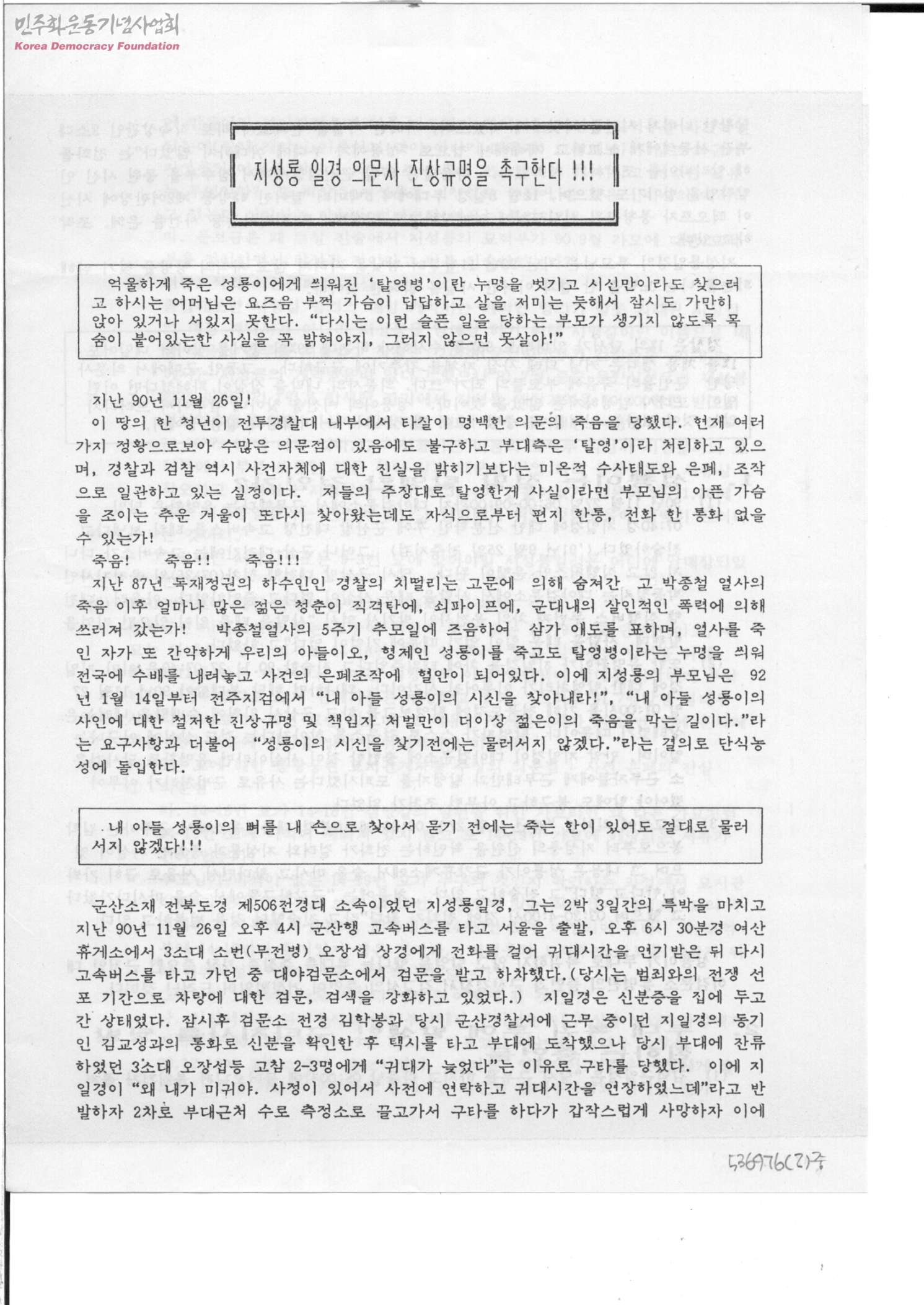 - 전북도경 제506전경대 소속 지성룡 일경 의문사 진상규명 촉구함.