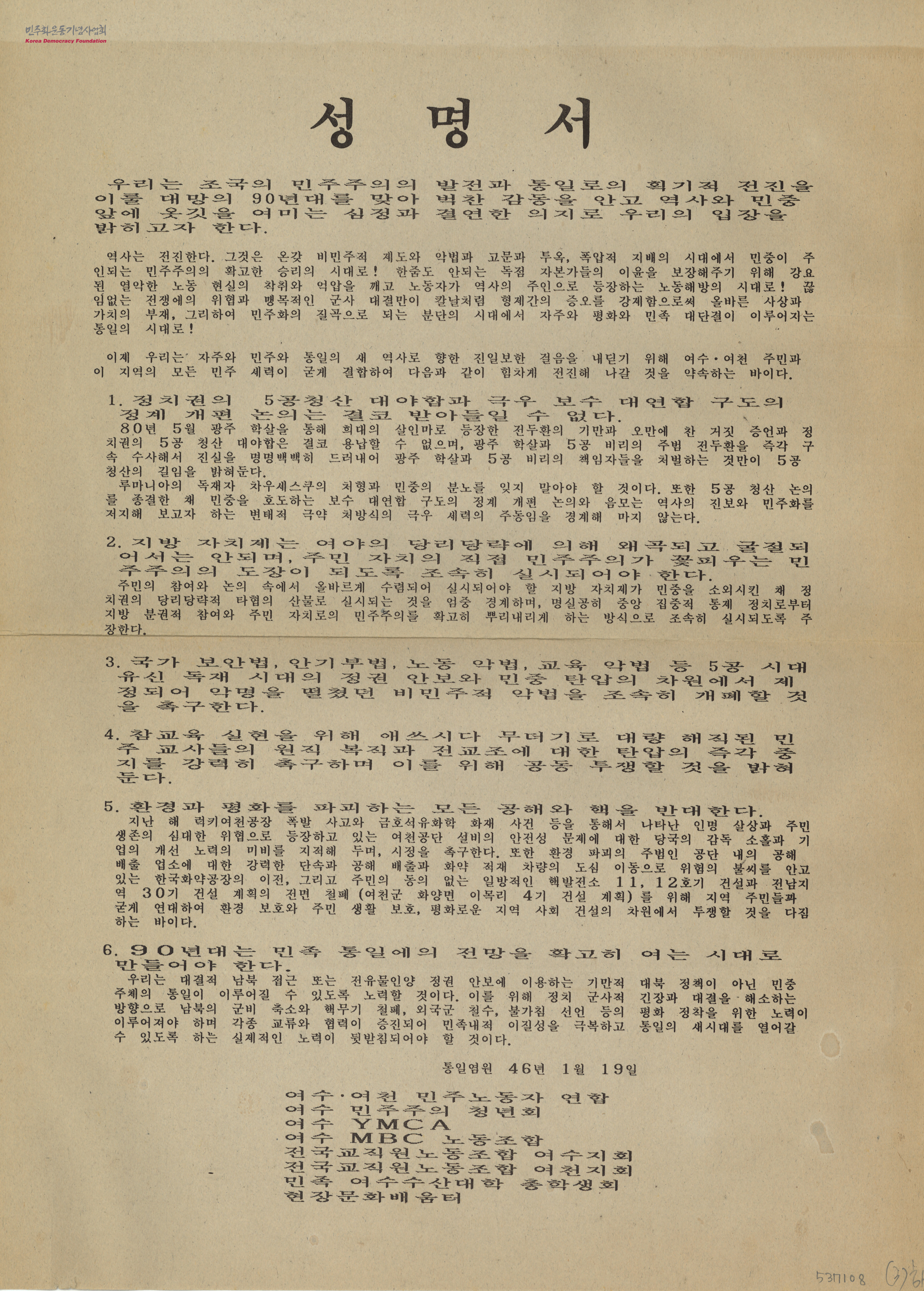 성명서[민주주의의 발전과 통일로의 획기적 진전을 이룰 대망의 90년대를 맞이하여 참여단체들의 입장을 밝힌 문서]
