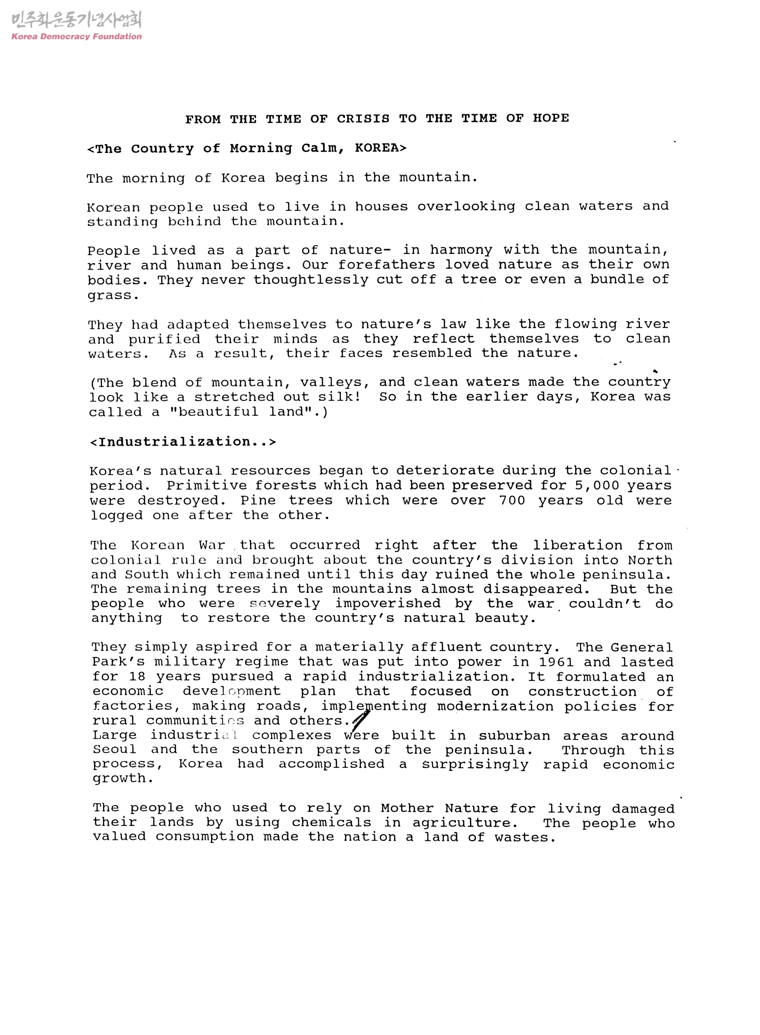 - - The Country of Mortning Calm, KOREA - Industrialization.. - Dying land, dying people - The Emergence of Green Civil Movement - Achievements and Tasks of Environment Policies - Evaluations (Interviews) - Reviving Han River - Conclusion