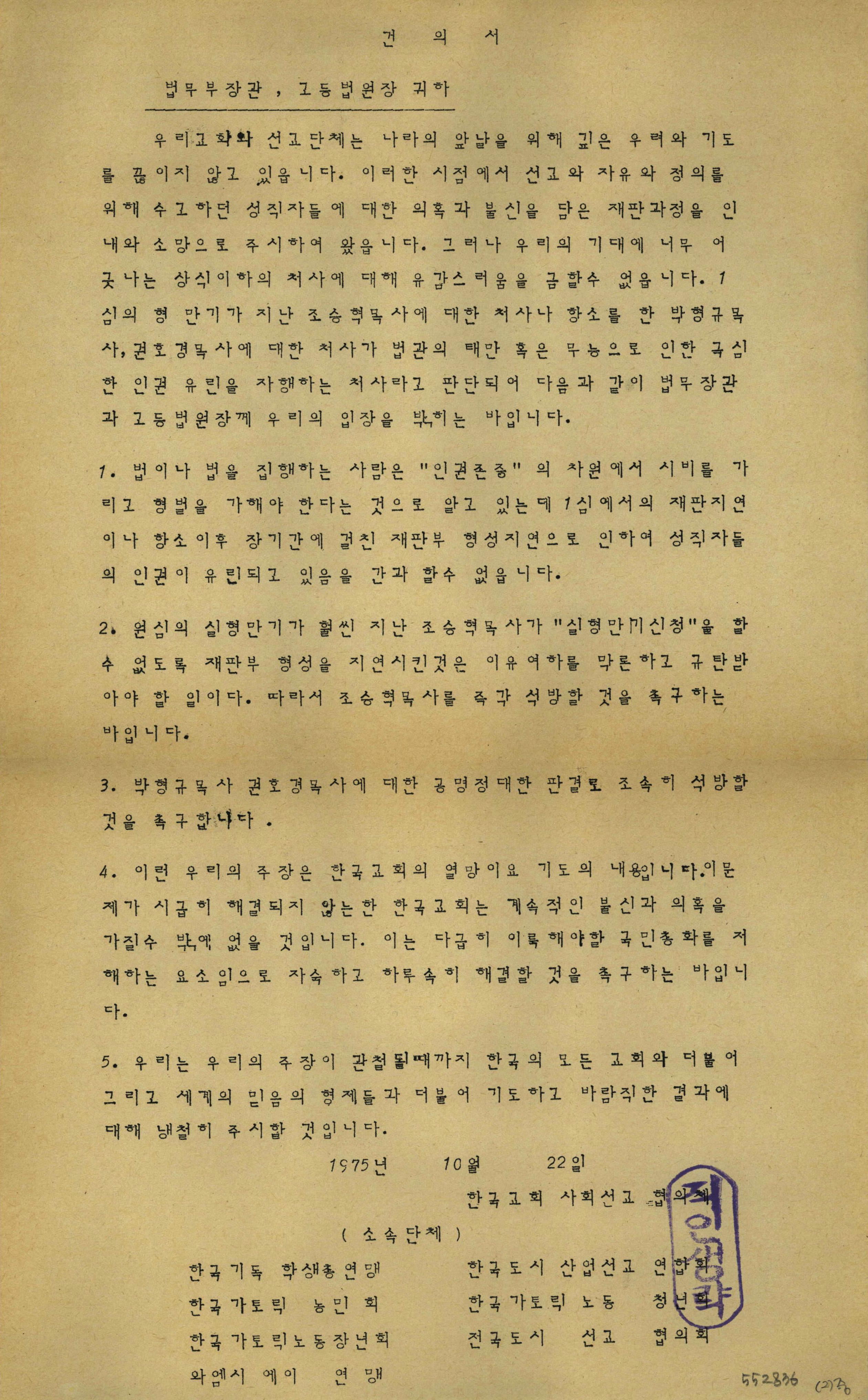 - 조승혁 목사 석방 및 박형규, 권호경 목사에 대한 정당한 판결,석방 요구 등.