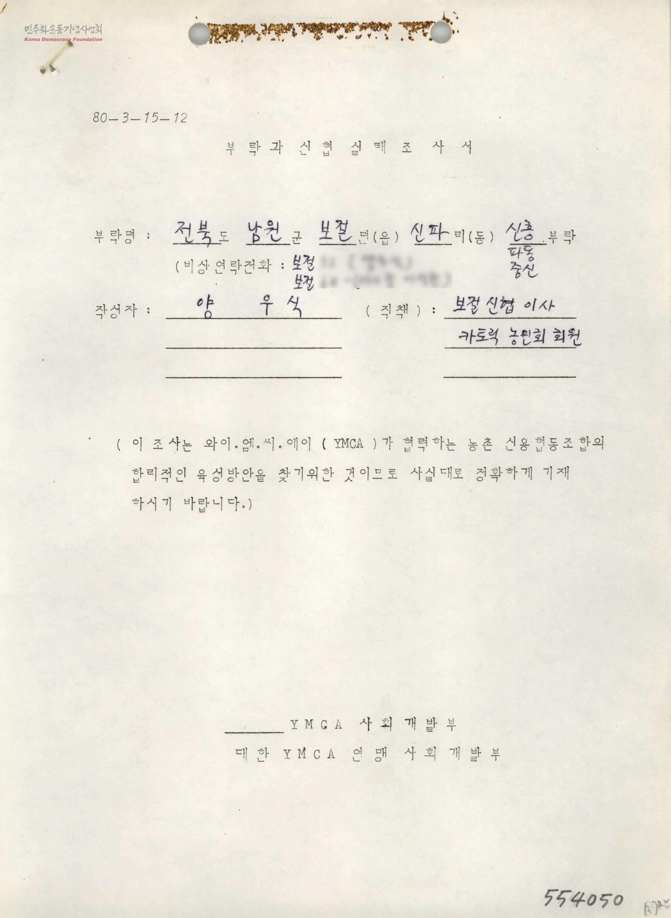 - 부락개황(신협 공동유대 부락) 1.지리조건 2.농가 구성과 인구 3.종교 4.경지 면적(소유 면적) 5.주요작물(판매금액이 많은 것 부터) 6.축산 7.대농기구(대수) 8.부채 9.단체(계 포함) 10.지도자(남,여,청소년) 신협현황 1.이름 2.사무실소재지 3.공동유대 4.조합원수 5.조합원 직업,종교 6.회의개회회수(79년) 7.지역개발사업 실적(협동사업,장학사업,문화사업 기타) 8.최근 3년간 자산 현황 9.신협운영상의 어려운 문제와 YMCA에 바라는 사항 10.현 임원명단 11.YMCA 직원이 처음부터 지금까지 이 신협(부락)을 방문한 회수 12.부락 공동재산 또는 협동사업 13.하고싶은 경제 협동 사업. 14.농촌 교육받은 분의 활동 상황.