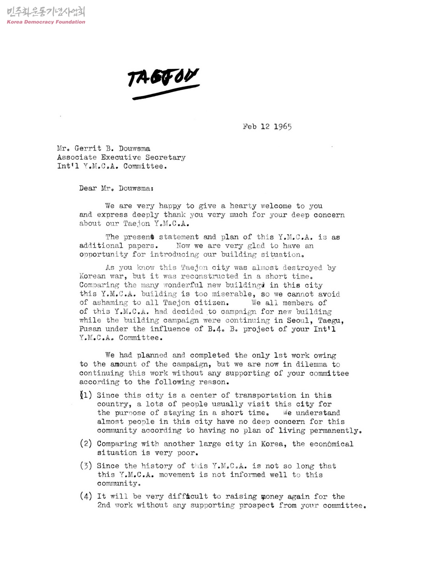 [Taejon YMCA의 Chang Kap Su(President)와 Young Pil Kim(General Secretary)이 Int'l YMCA Committee의 Gerrit B. Douwsma(Association Executive Secretary)에게 보내는 영문서한]