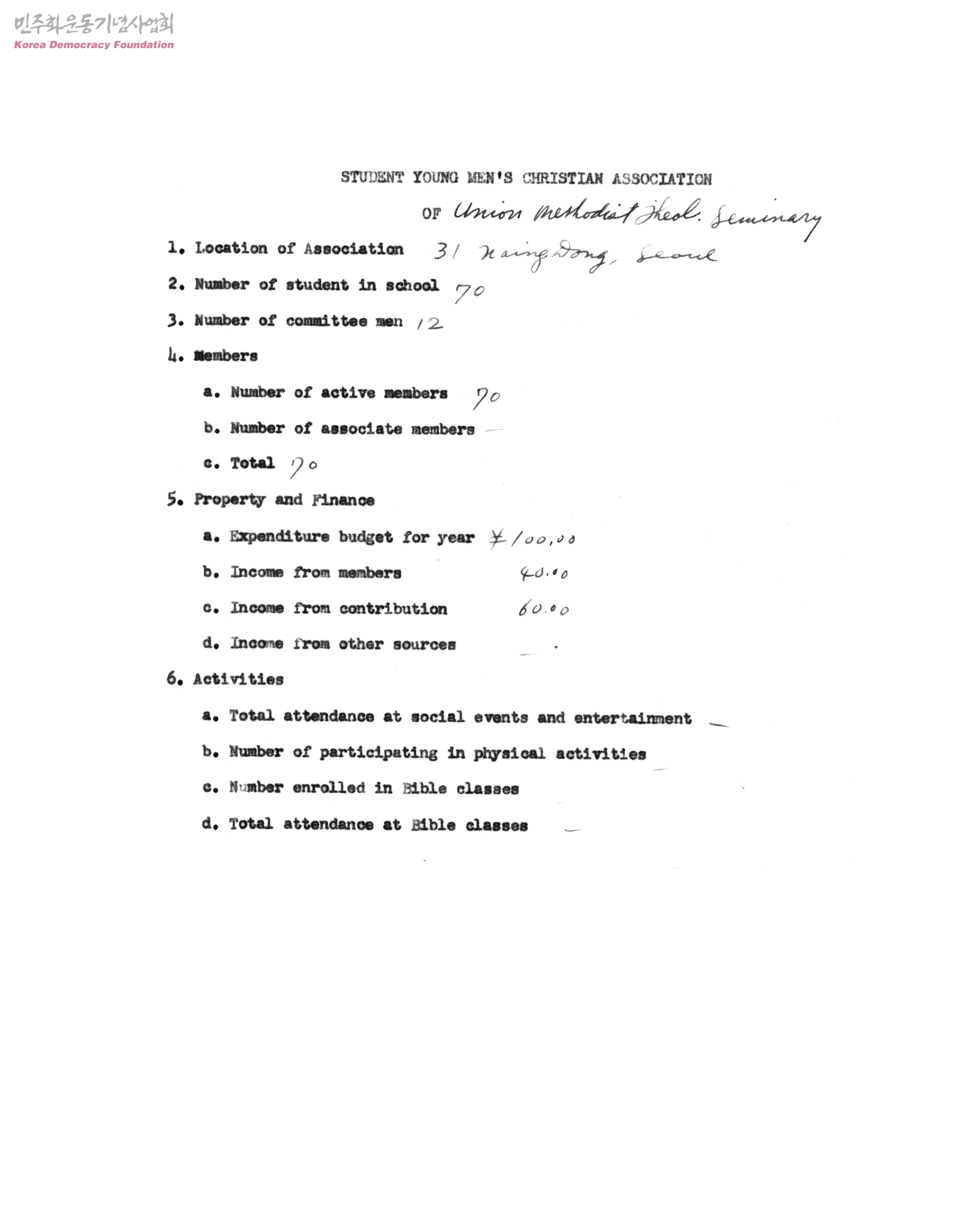 - 1.Location of Association 2.Number of Korean Population of City 3.Number of employed officers 4.Members 5.Property and Finance 6.Activities.