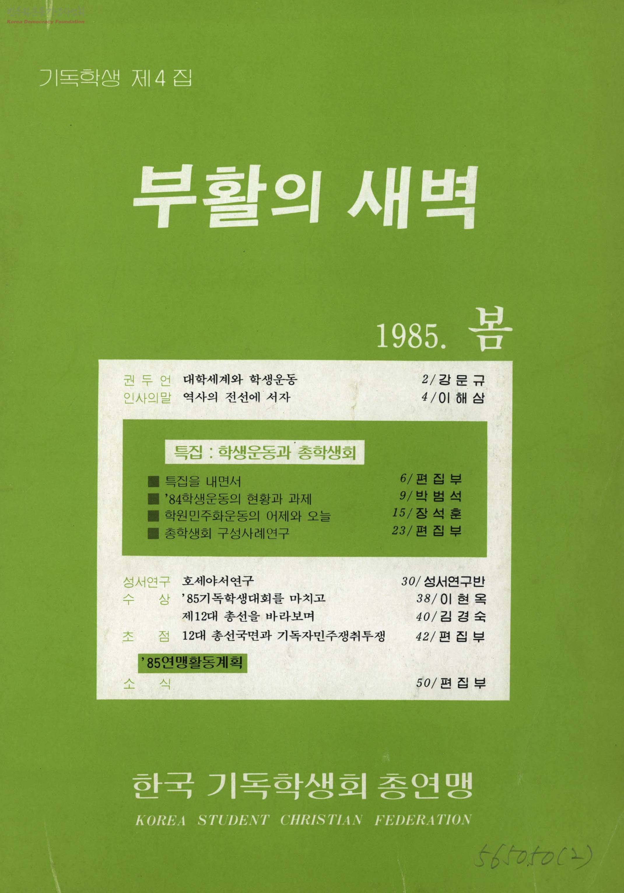 - 권두언-대학세계와 학생운동 인사의말-역사의 전선에 서자 특집-학생운동과 총학생회 성서연구-호세야서연구 수상-'85기독학생대회를 마치고 제12대 총선을 바라보며 초점-12대 총선국면과 기독자민주쟁취투쟁 '85연맹활동계획 소식.