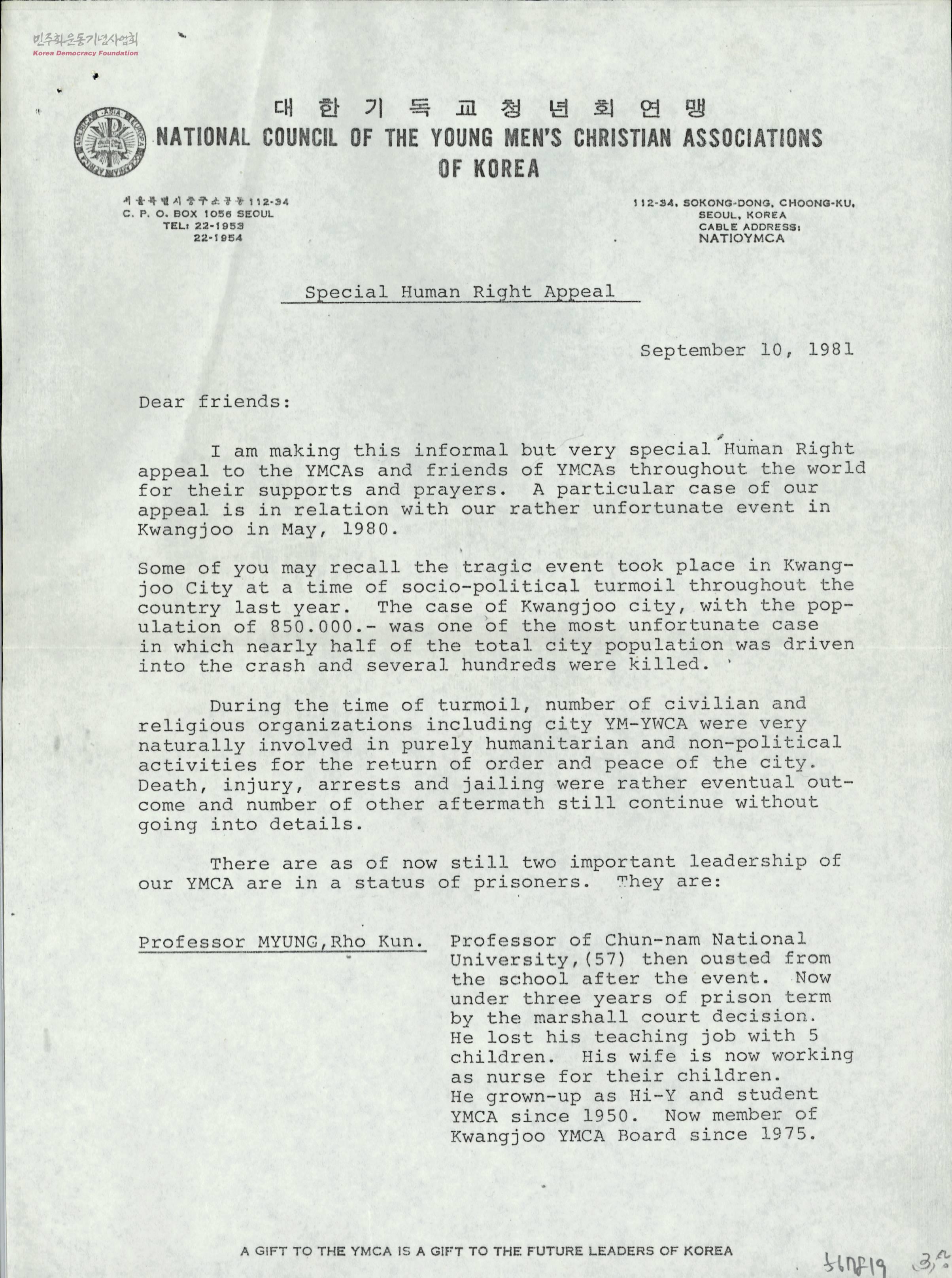 - 1980년도 광주항쟁시 YMCA 관계자(명노근, 김천배) 구속, 석방 및 비용 지원 요청.