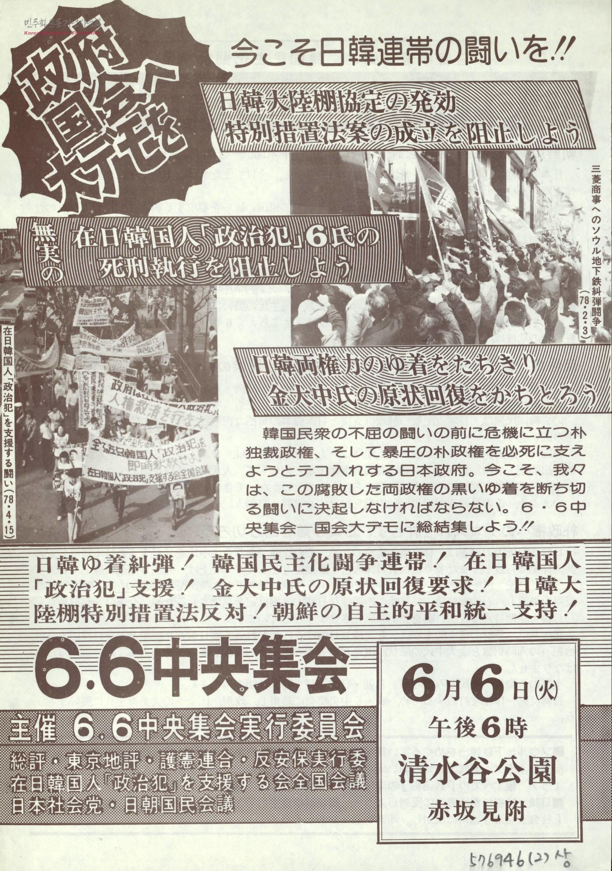 - * 집회목적 - 일한유착규탄 - 한국민주화투쟁연대 - 재일한국인 정치범 지원 - 김대중씨의 원상회복 요구 - 일한대륙붕특별조치법 반대 - 조선의 민주적평화통일지지