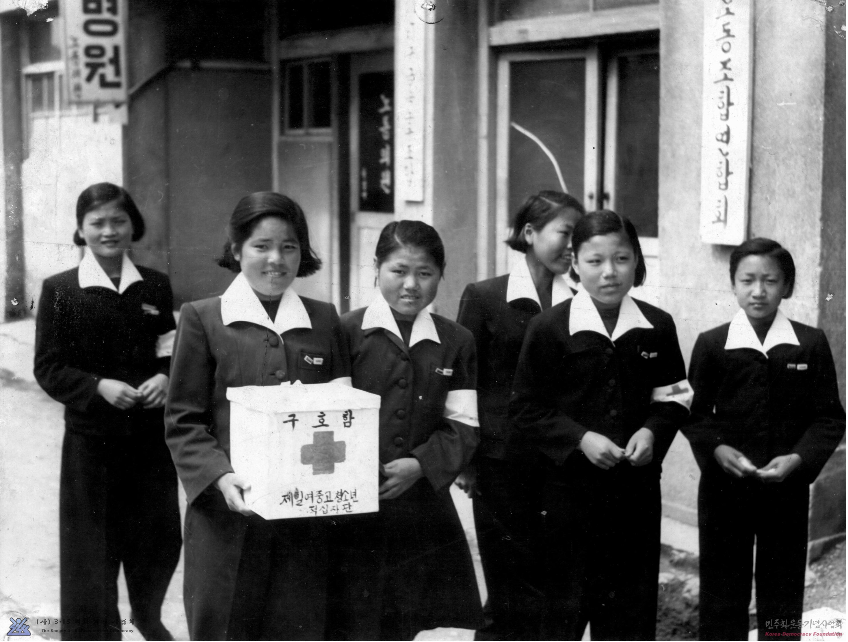 - *사진메모 : 제일여중고적십자 단원들이 3.15의거 때 사망한 사람과 부상자들을 돕기위해 거두모금에 나서고 있다.
