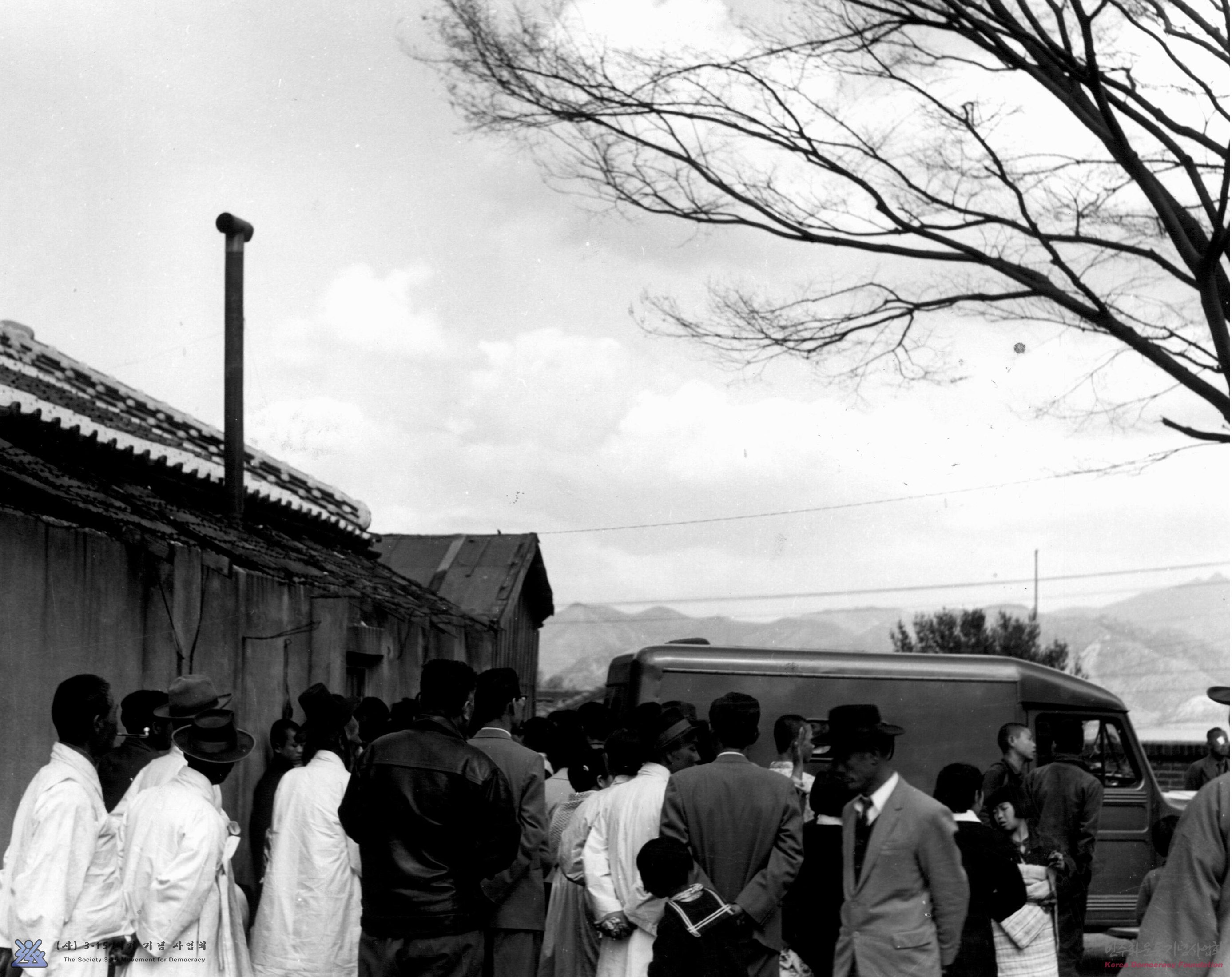 [마산의거사건으로 재판받기 위해 도착하고 있는 시위 연루자를 만나기 위해 장사진을 이루고 있는 광경-마산지방검찰청 광장]