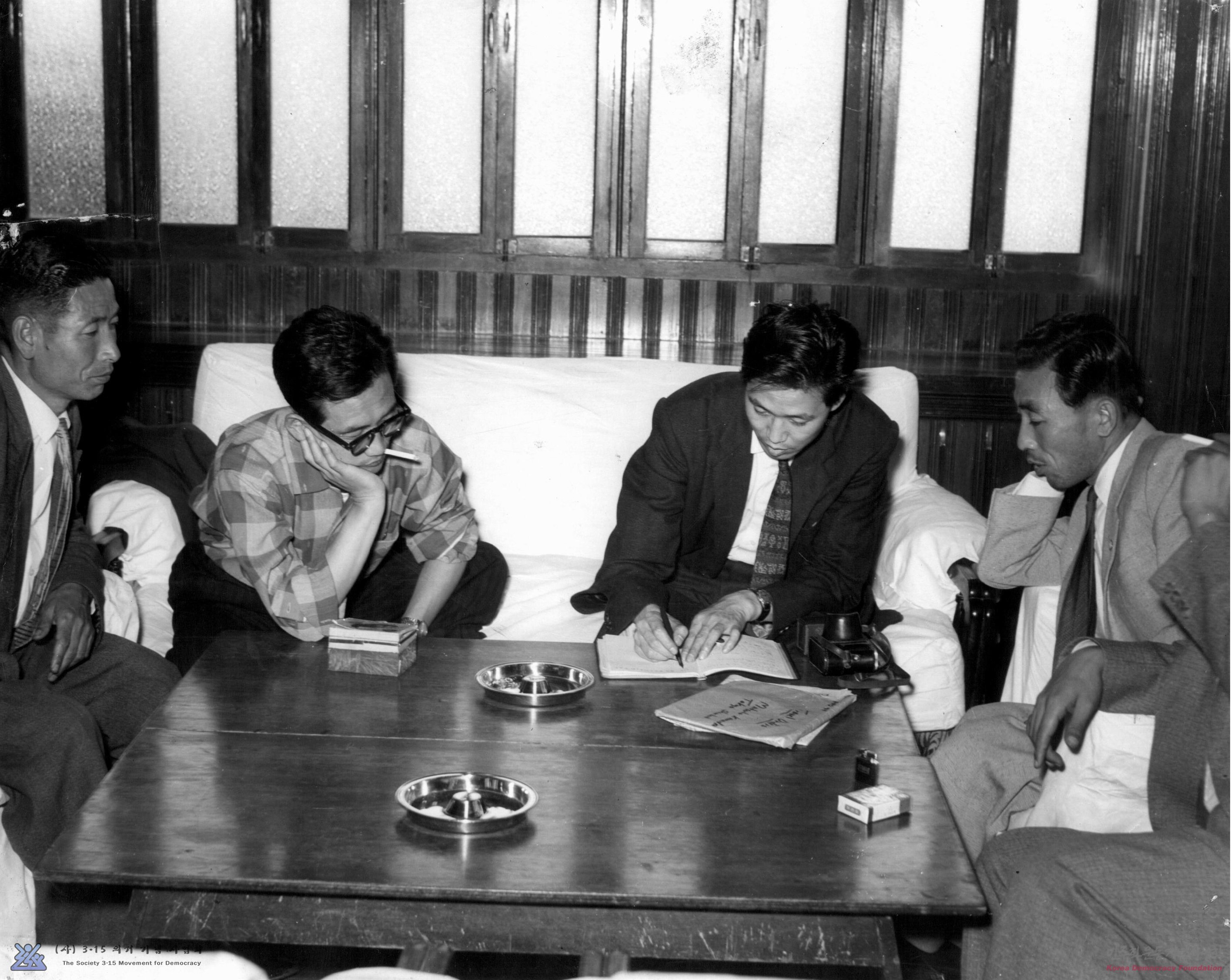[마산의거사건 취재를 위해 일본기자가 신마산 외교다방 2층에서 국내취재진에게 상황전모에 대해 청취, 메모하고 있는 광경]