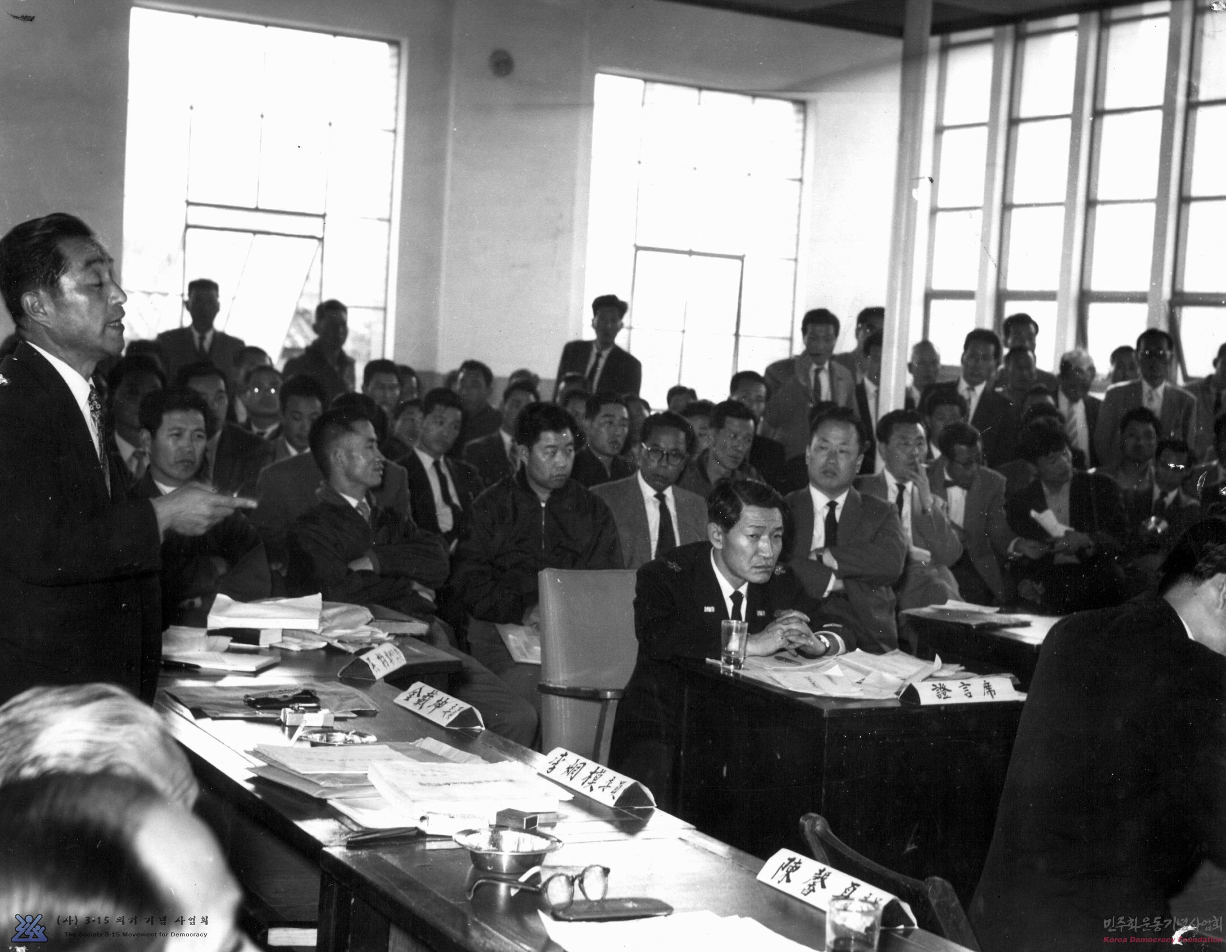 [제2차 국회조사위 민주당측 "김재곤"의원이 "이정용"씨에 대해 집요한 추궁을 하고있는 광경-마산상공회의소 2층]