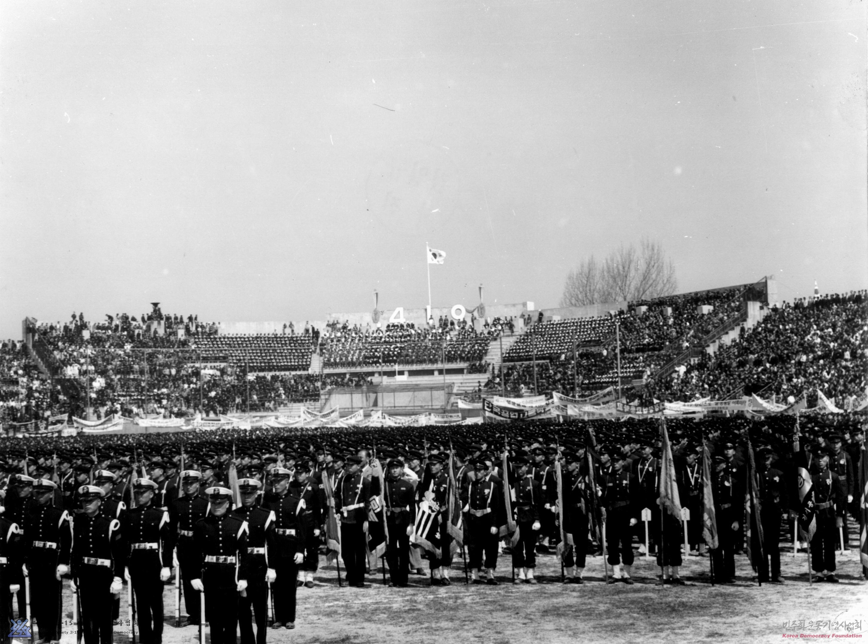 [4.19혁명 제1주념 기념식 및 추념식-도열해있는 각급 고등학교, 대학교 학생들 및 군의장대 광경]