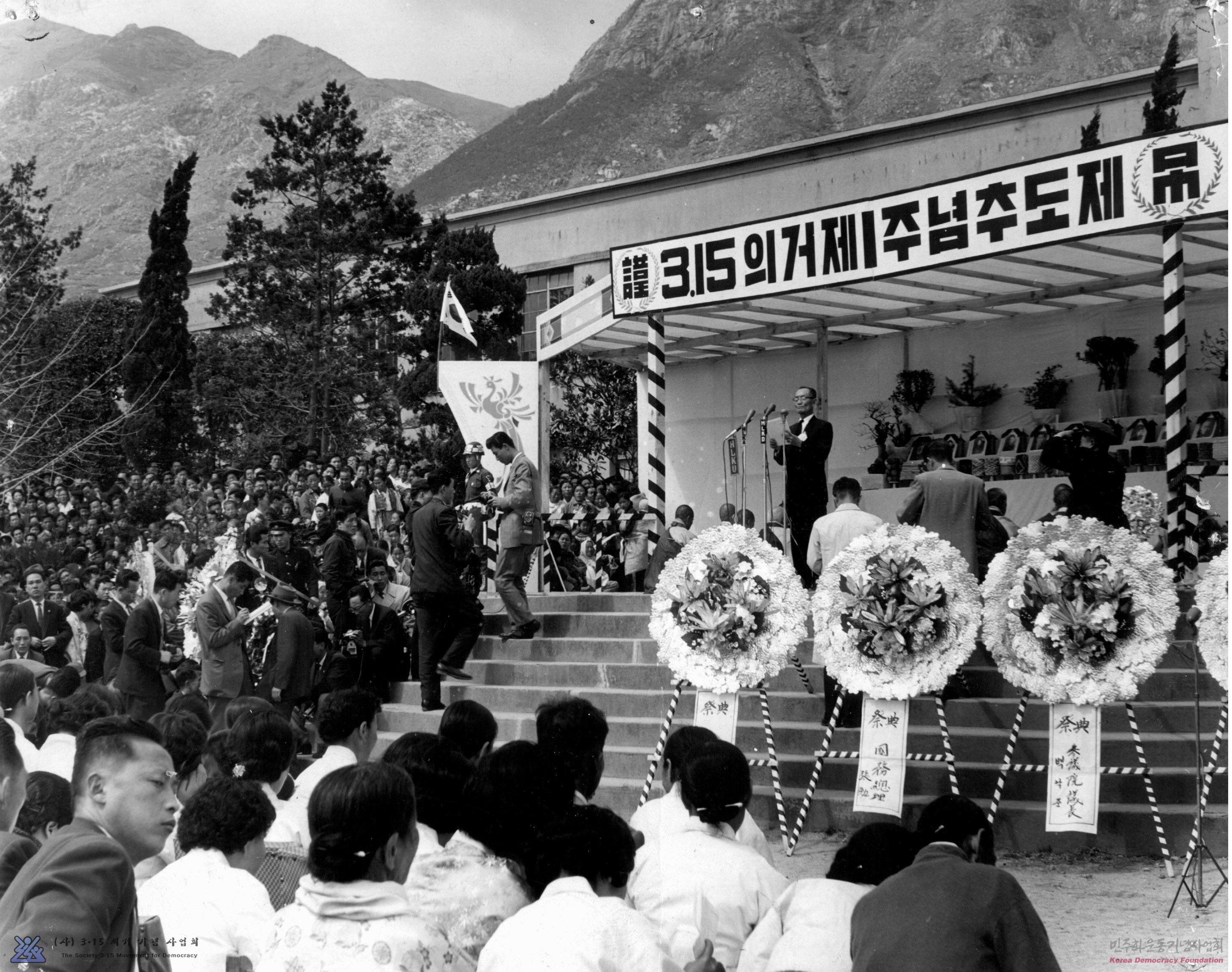 [제1주년 3.15의거 추도제-곽상훈 민의원장의 추도사 광경, 마산고등학교 교정]