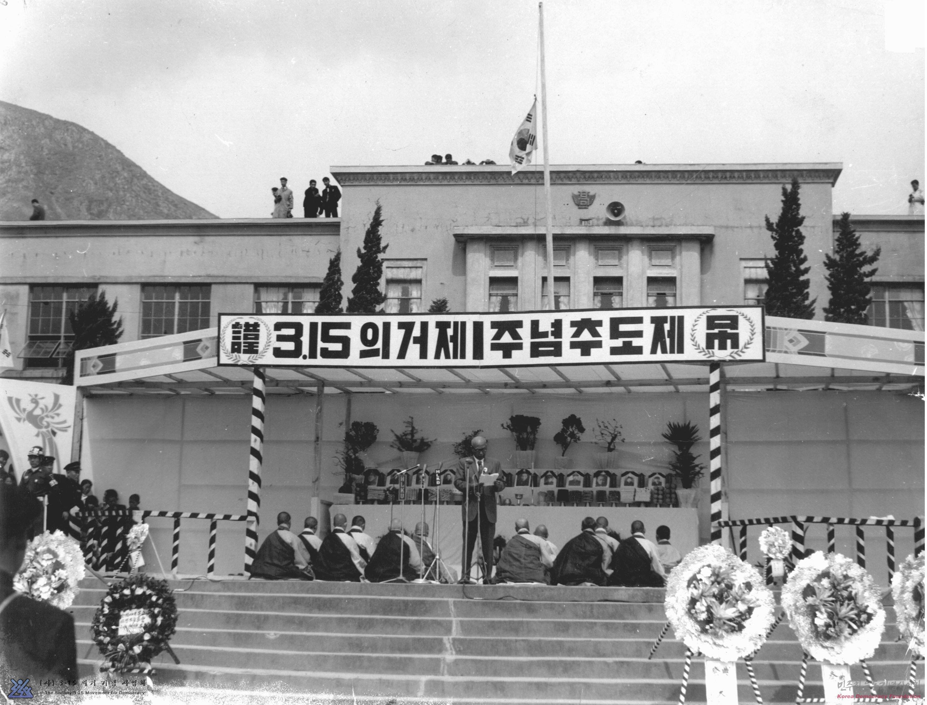 [제1주년 3.15의거 추도제-배정현 대법원장대리의 추도사 광경, 마산고등학교 교정]
