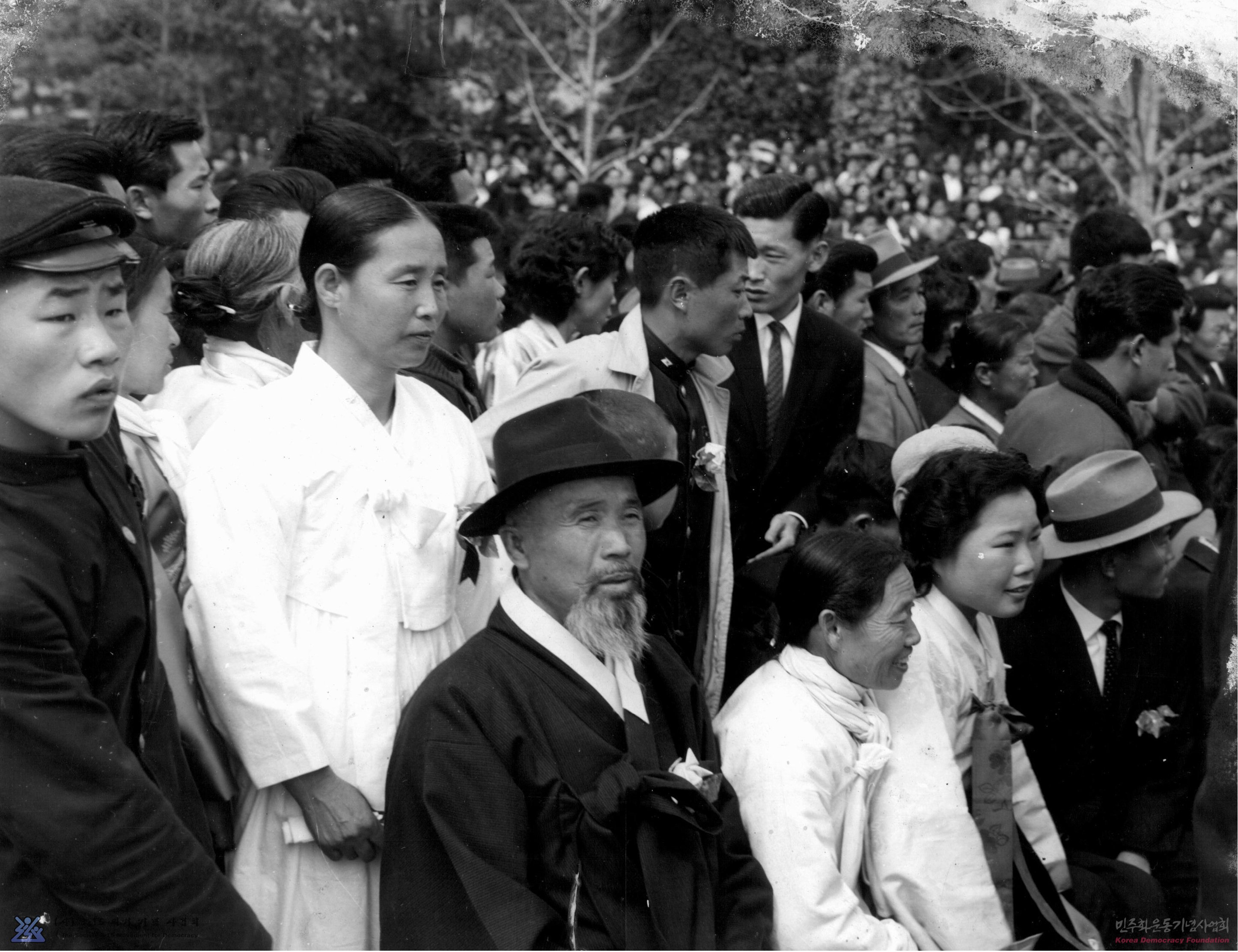 [제1주년 3.15의거 추도제에 참석하신 권찬주여사(할아버지 뒤에 서 계신분), 마산고등학교 교정에서]
