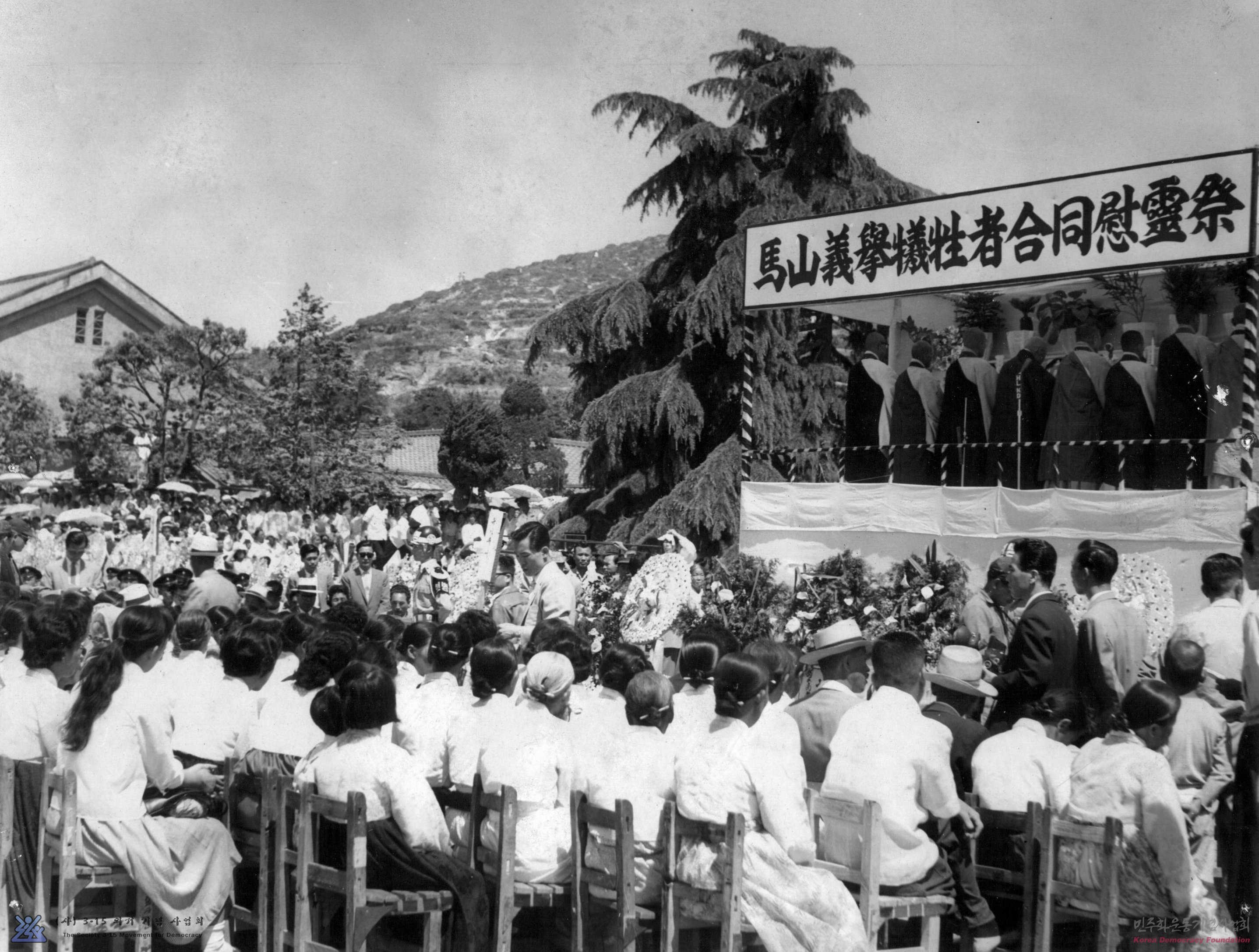 [마산의거 당시 유명을 달리한 젊은 청년, 학생들의 넋을 기리기 위해 「3.15의거 희생자 합동위령제」가 거행되고 있는 광경-마산상업고등학교 교정]