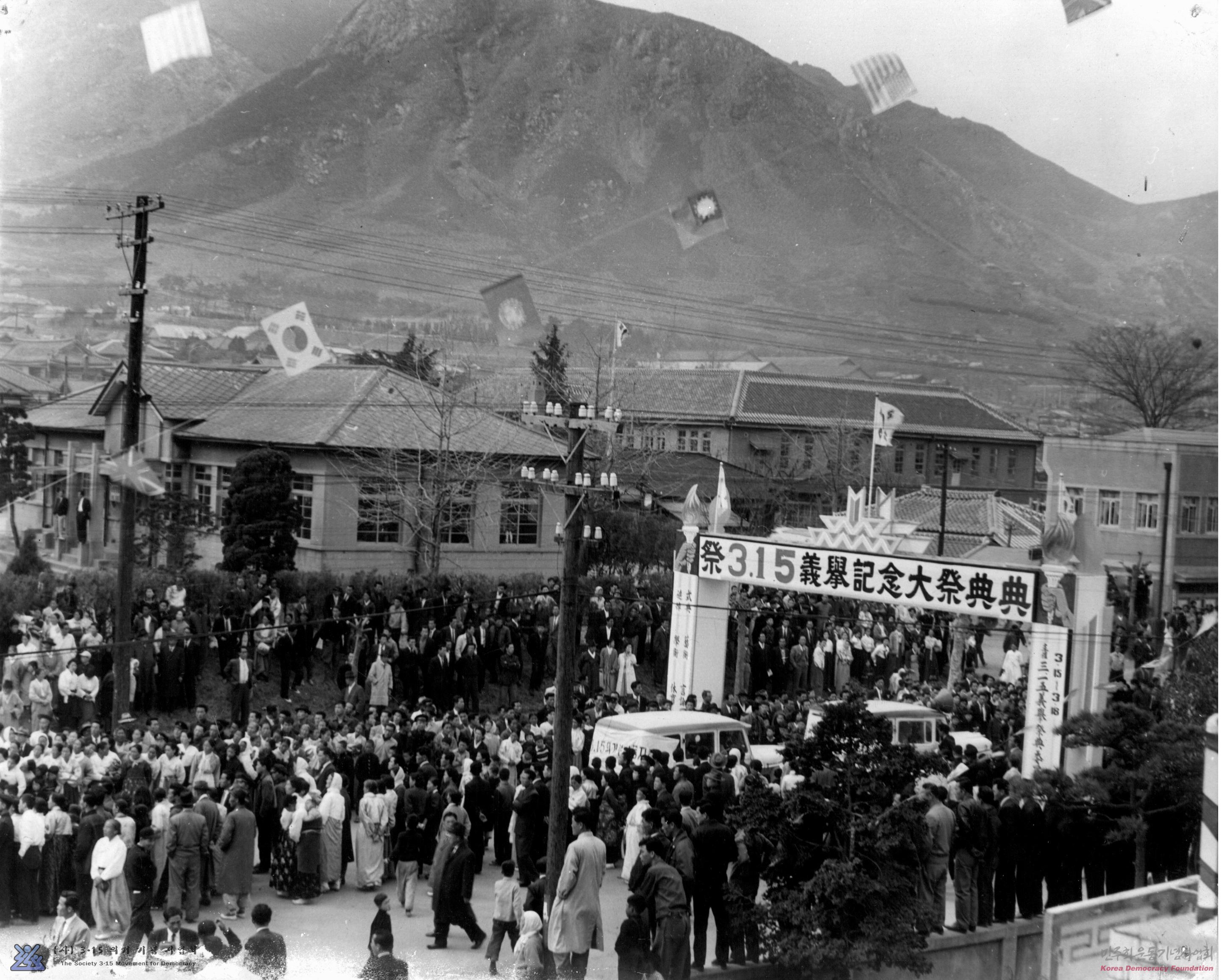 [수많은 시민들이 지켜보는 가운데 3.15의거 기념대제전이 열리고 있는 마산시청앞 가두 광경]