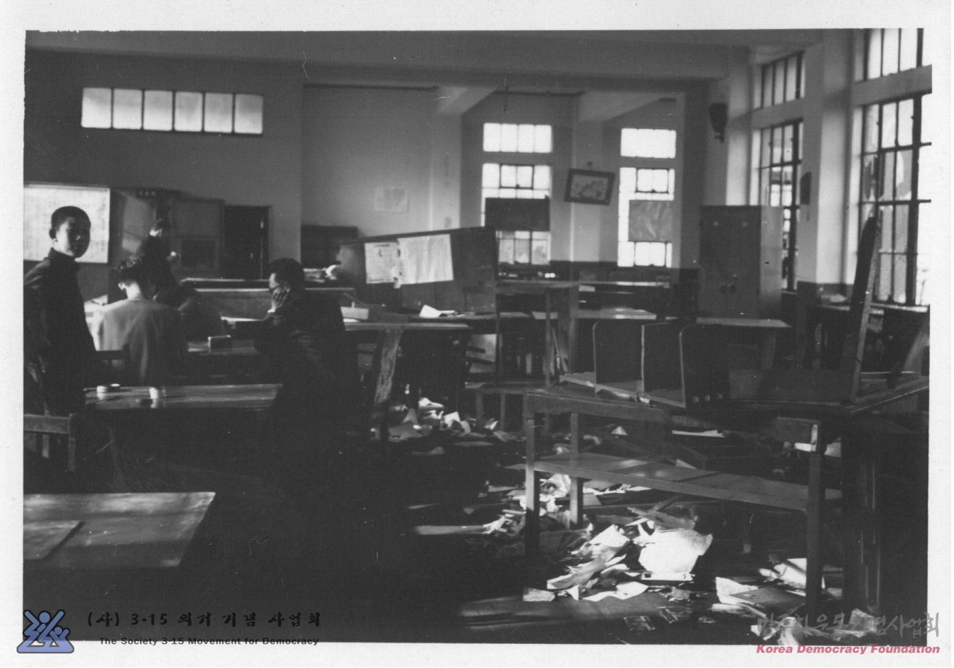 [시위대에 의해 파괴된 마산경찰서 수사과에서 시위주동자를 잡아와 심문하고 있는 모습]