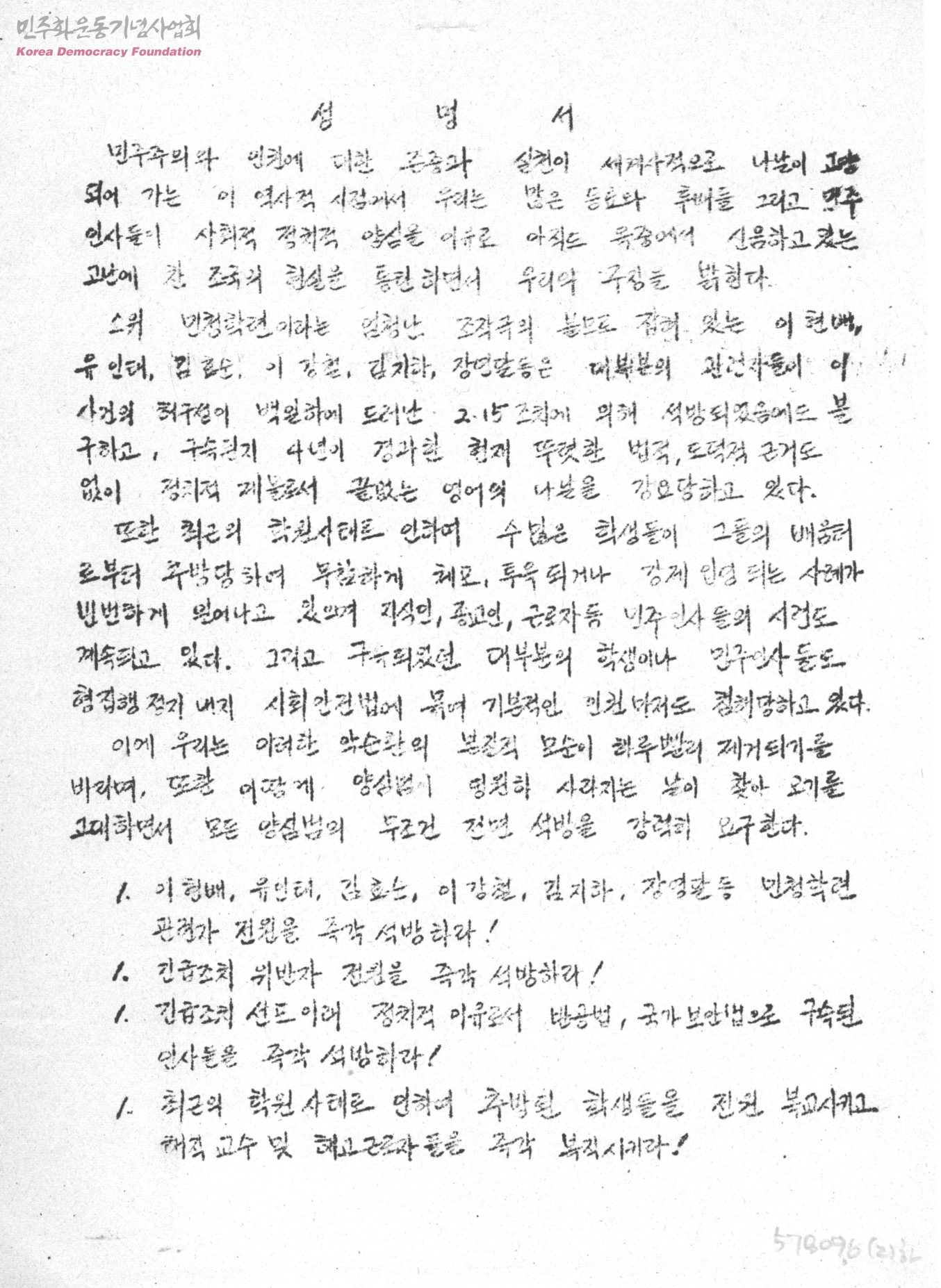 - - 이현배, 유인태, 김효순, 이강철, 김지하, 장영달 등 민청학련 관련자 전원을 즉각 석방하라! - 긴급조치 위반자 전원을 즉각 석방하라! - 최근의 학원사태로 이해 추방된 학생들을 전원 복교시키고 해직교수 및 해고근로자들을 즉각 복직시키라!