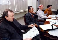 국민회의 신년상견례에서 주요 논의 내용을 전달하는 문익환 의장
