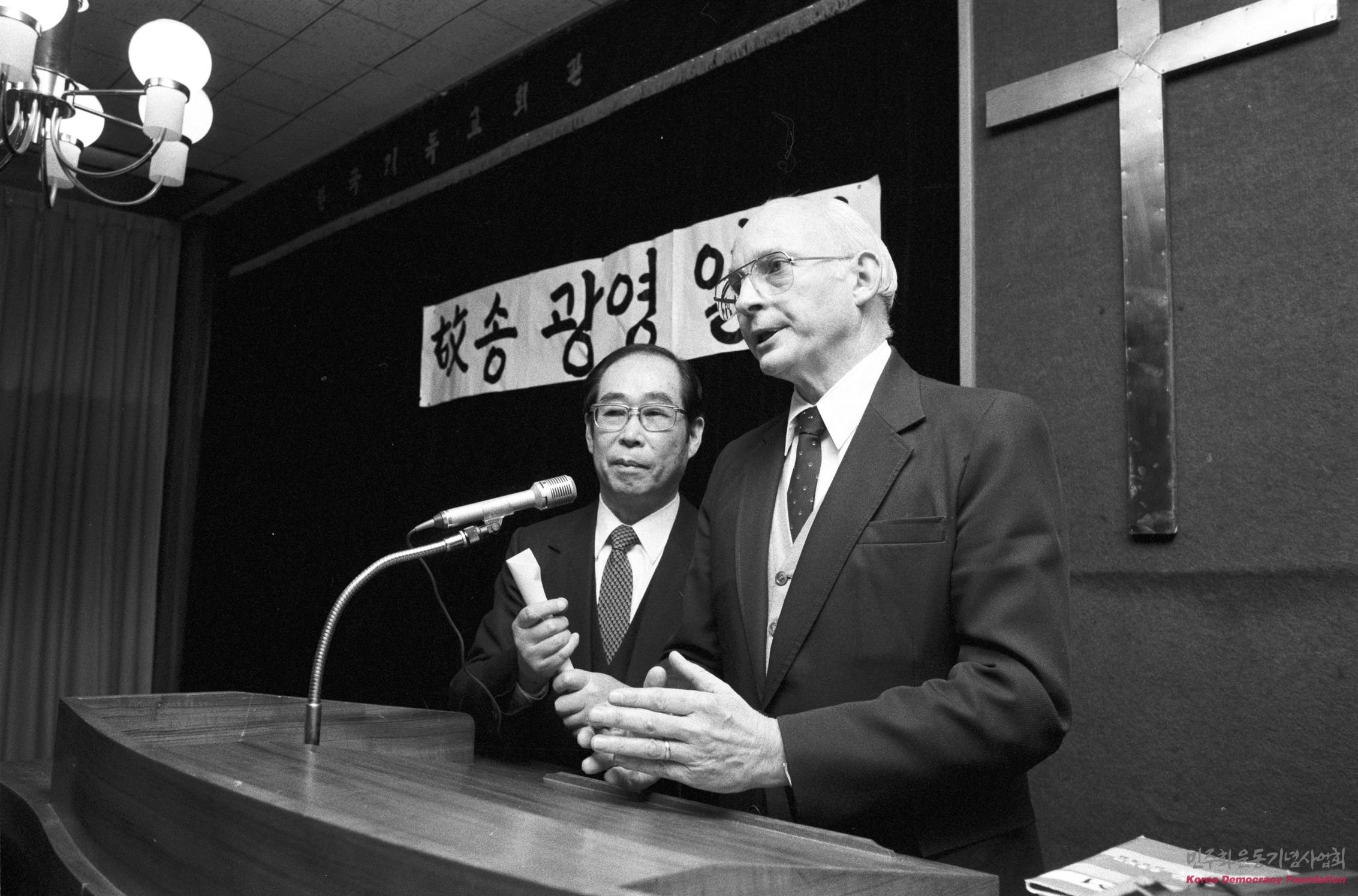 송광영 열사를 위해 추도사를 하고 있는 외국인