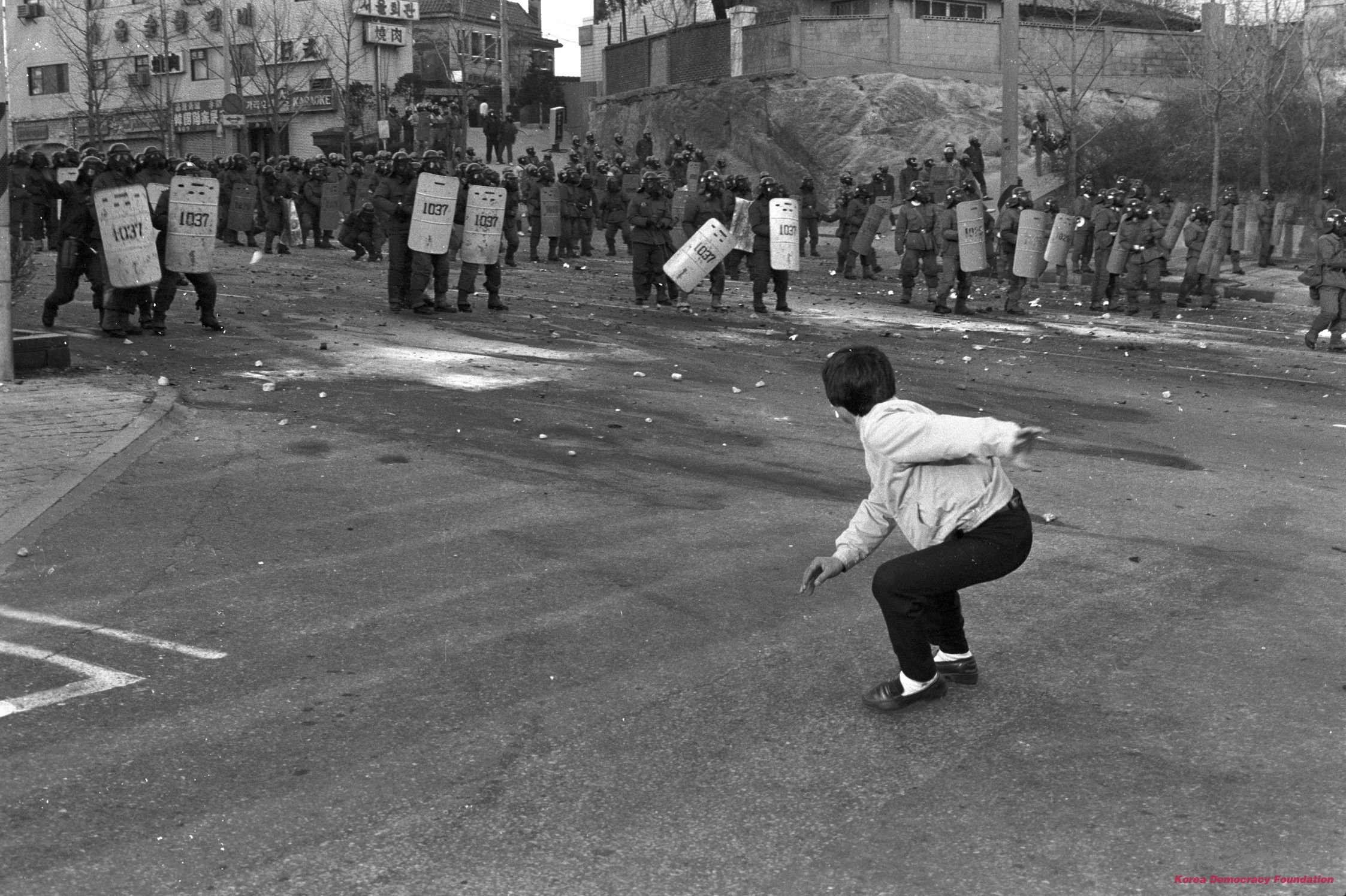공권력으로 시위를 진압하려는 전경들에게 투석을 하는 학생
