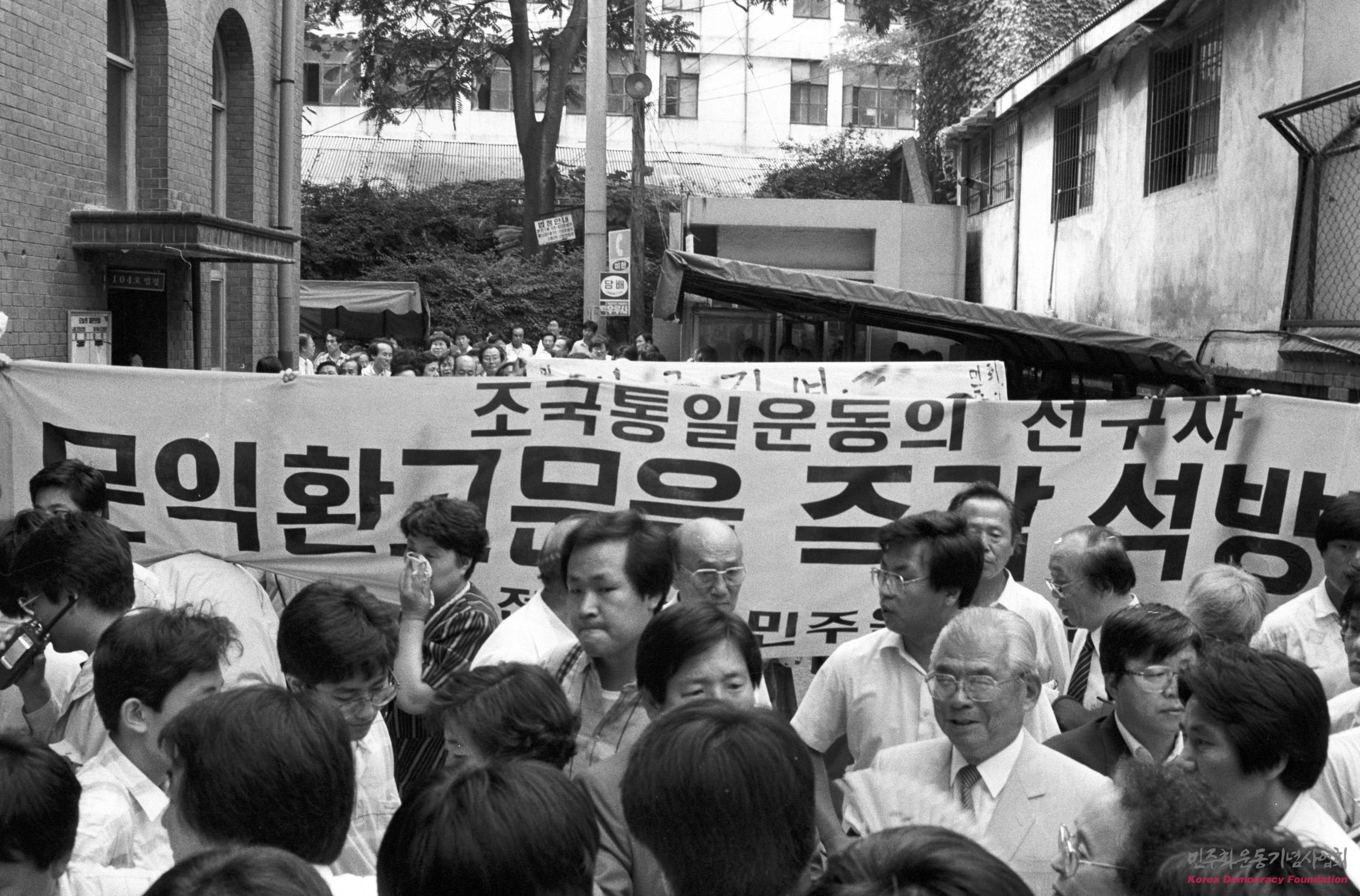 문익환 목사 1차 재판이 열리는 서소문 법원 앞에서 조국통일운동의 선구자 문익환 고문의 석방을 요구하는 시민단체 회원들