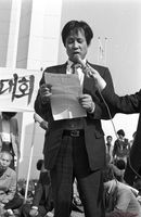 석방청년학생환영 및 양심수 전원석방 수배자 전원해제 쟁취결의대회에서 수배자 가족들의 고충에 대해 이야기 하는 박계동의 부인