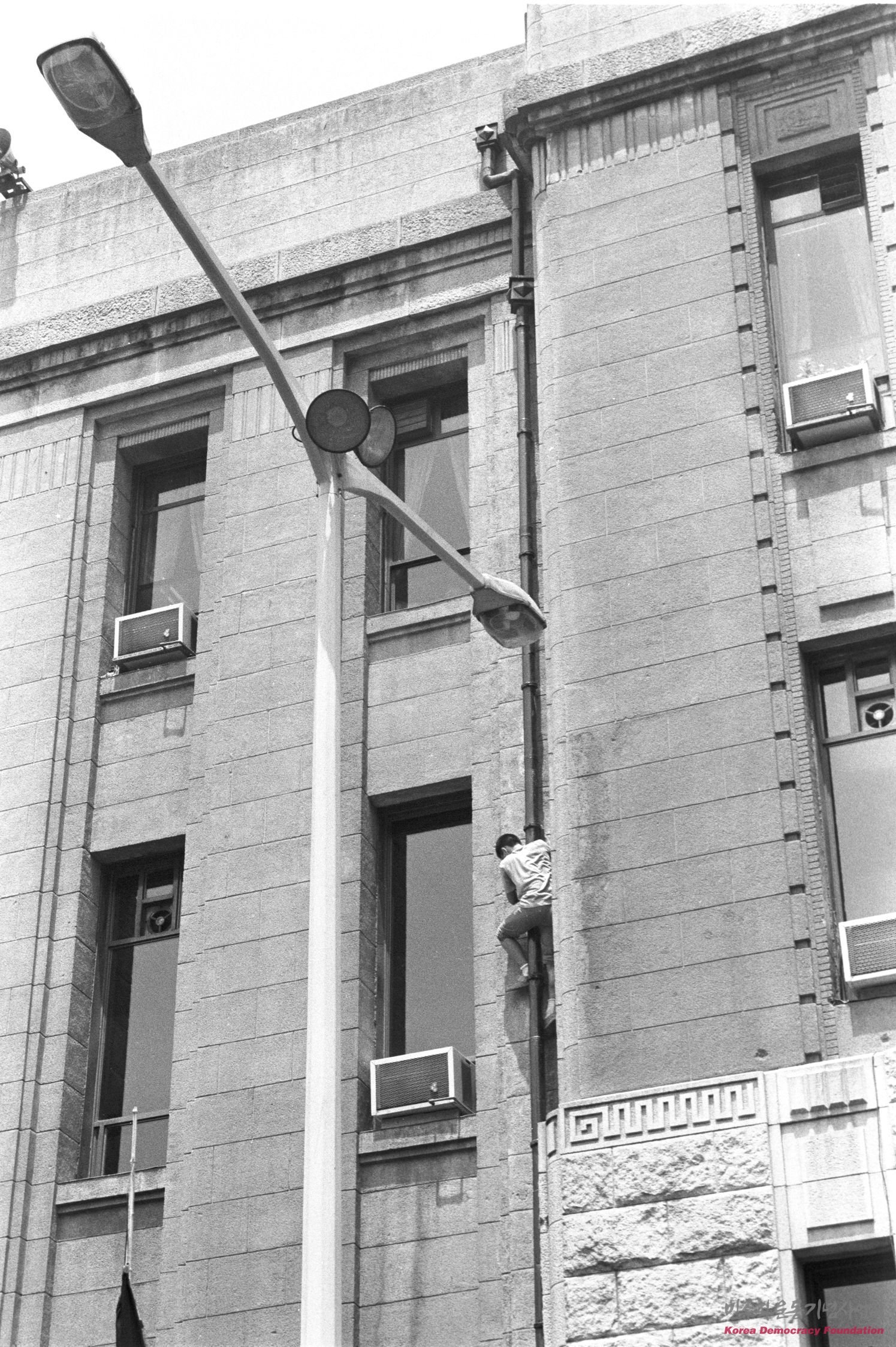 시청 옥상 위의 태극기를 반기로 내리기 위해 게양대로 올라가는 한 시민