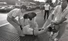연대 학생회관 앞에서 독점재벌을 상징하는 허수아비를 세우고 있는 학생들