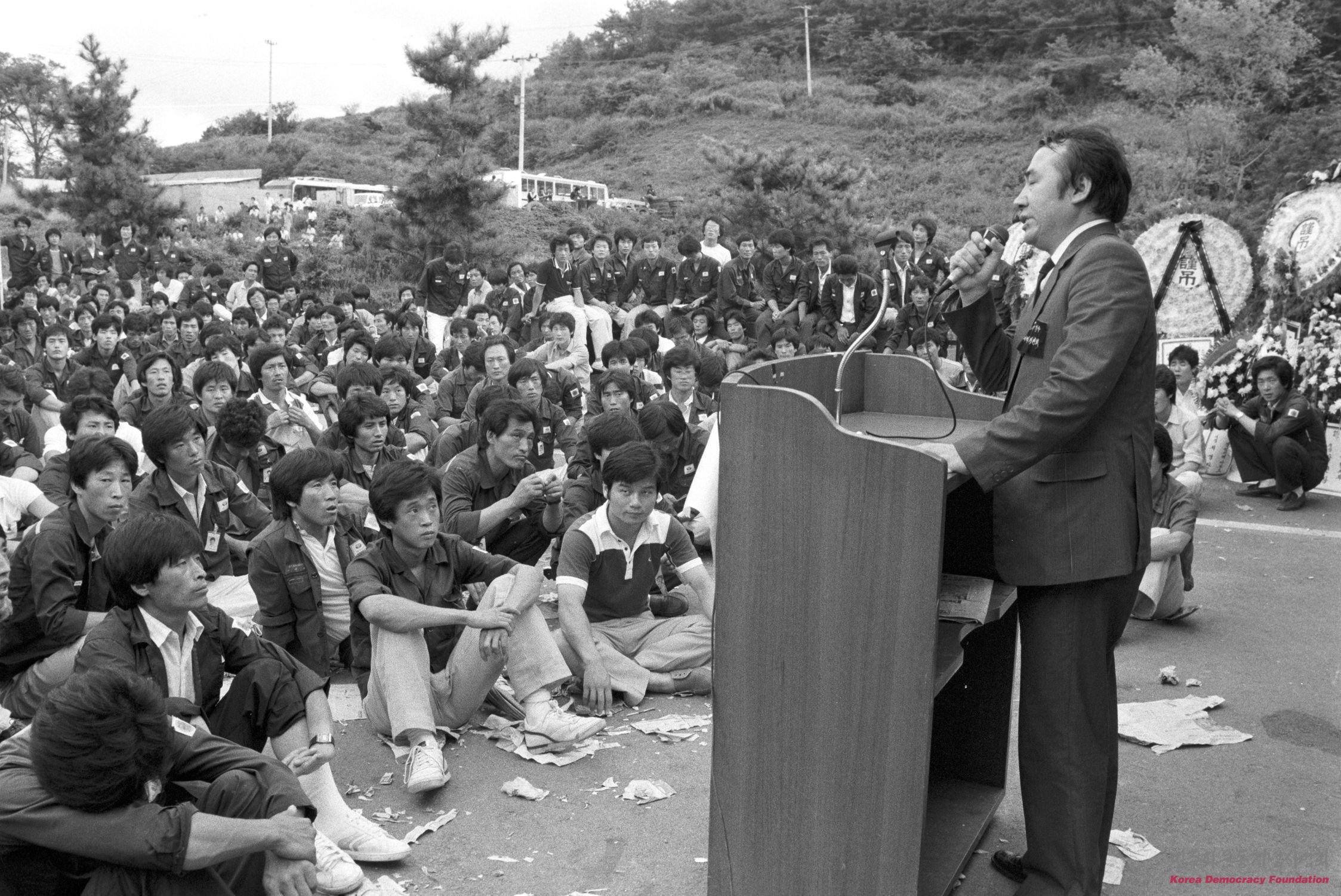 김우중 회장이 다녀간 뒤 대우조선 노동자 앞에서 장례위원 입장을 밝히고 있는 이상수
