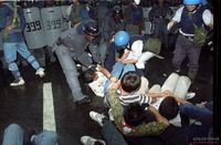 민족해방 운동 69주년 기념식이 끝날 무렵 나타나 난동을 피우는 괴청년들