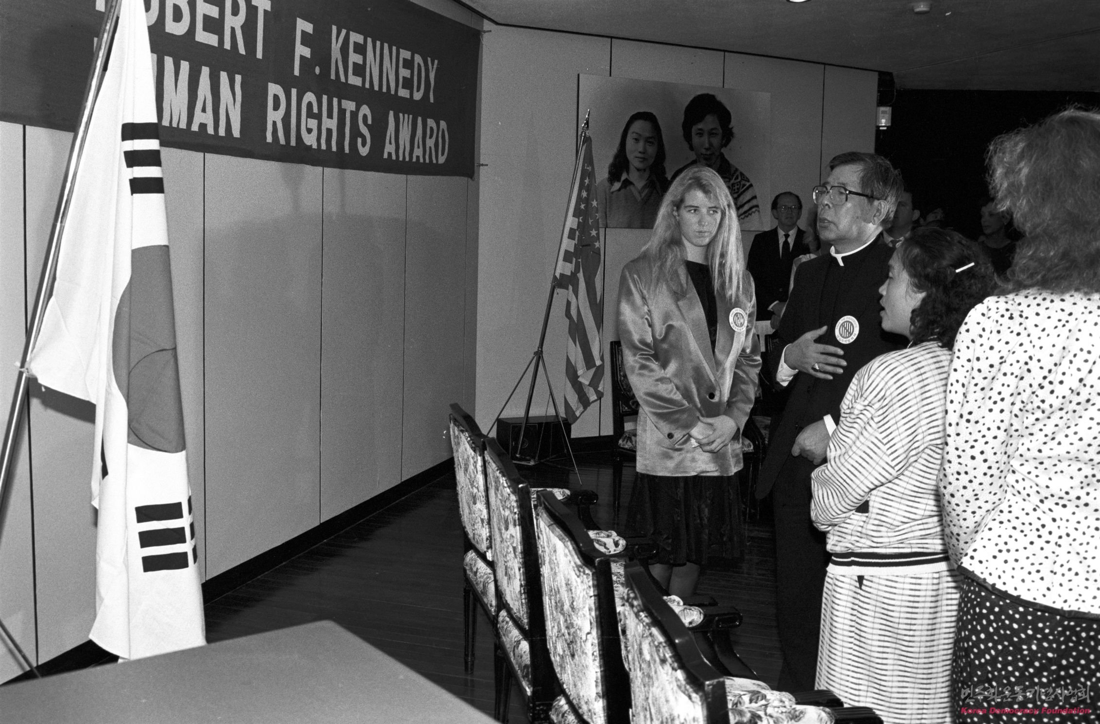 케네디 인권상 시상식에서 태극기를 향해 애국가를 부르고 있는 김수환 추기경과 인재근