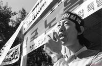 옥중의 김근태 민청련 의장을 대신하여 수상하고 있는 부인 인재근