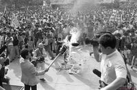 참교육을 위한 민족 문학의 밤 행사에서 구호를 외치는 참가자