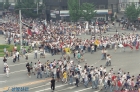 "노점상도 사람이다. 사람답게 살고싶다" 는 플래카드를 들고 농성 중인 노점상인들과 제지하는 경찰 모습