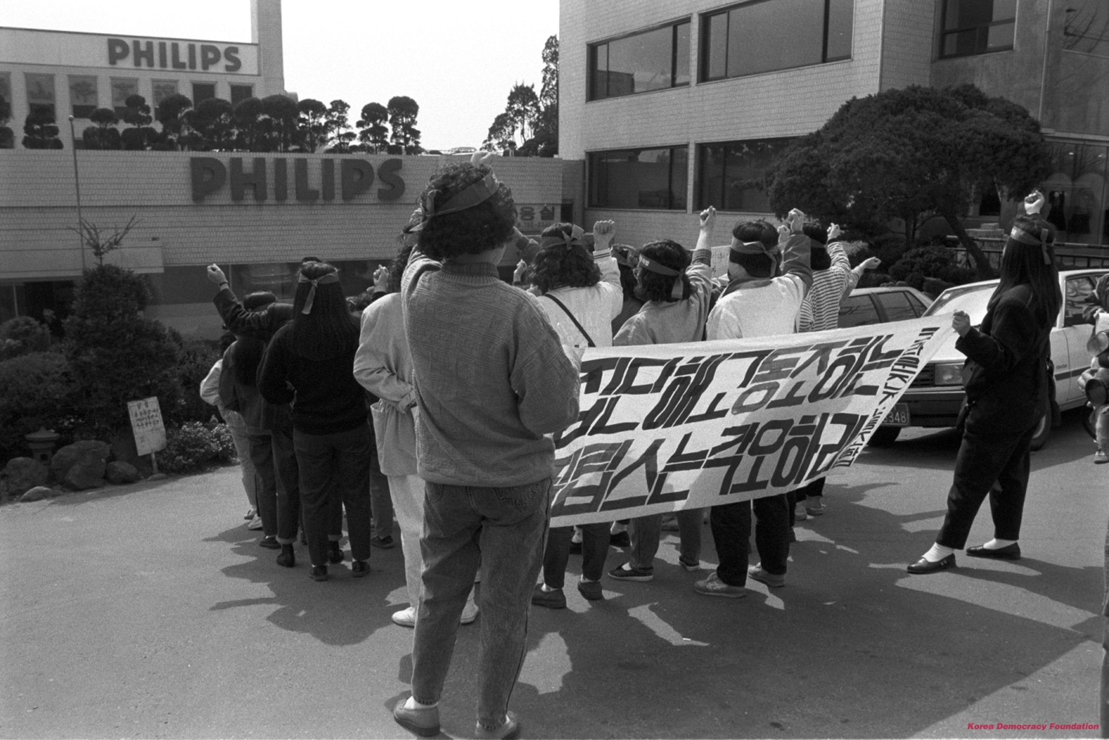 필립스사 앞에서 집단해고에 동조하는 행위를 규탄하는 시위를 벌이는 사람들의 모습