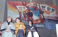 "통일의 기수 문익환 목사님을 즉각 석방하라"는 현수막을 내걸고 총회를 갖고 있는 양심수 후원회 회원들의 모습