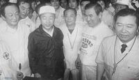 민주창당대회에서 양손을 들고 인사하는 박찬종, 이기택