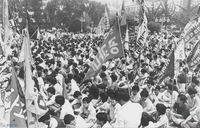 아기를 업고 머리에 투쟁 끈을 매면서 투쟁에 나선 젊은 여인
