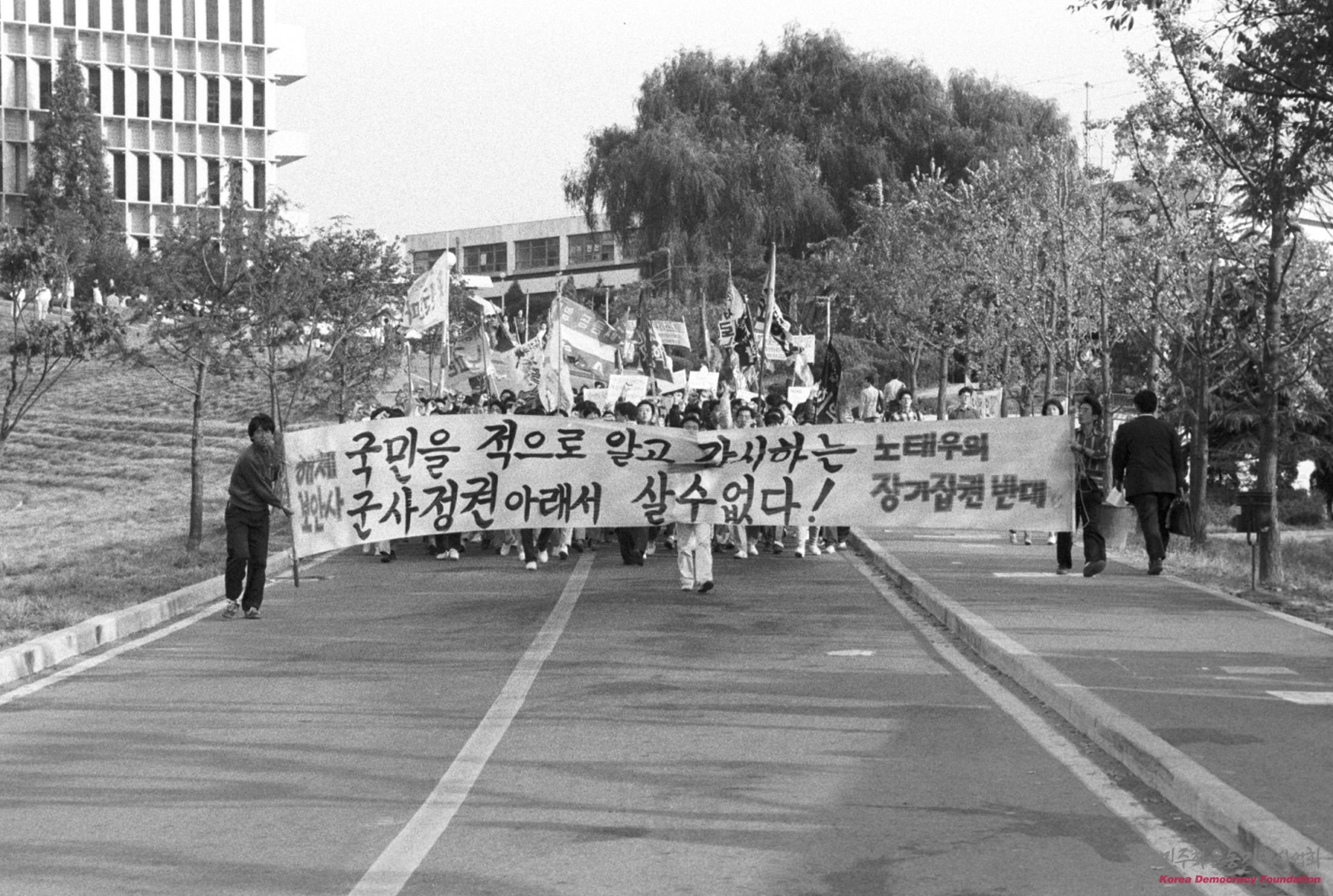 "국민을 적으로 아는 노태우 정권 물러가라, 군사정권 아래서 살수없다" 는 플래카드를 들고 가두시위를 하는 학생들