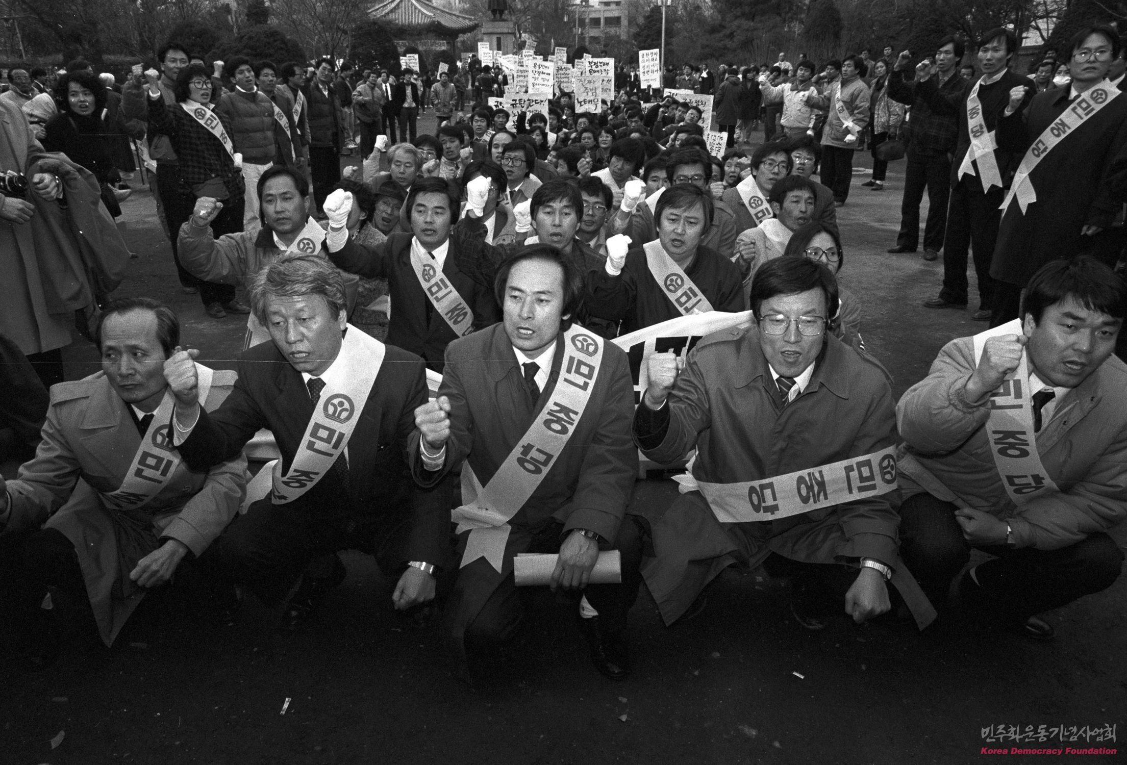 탑골공원에서 열린 부패정권 규탄 대회에 참가한 민중당 의원들의 연좌한 모습