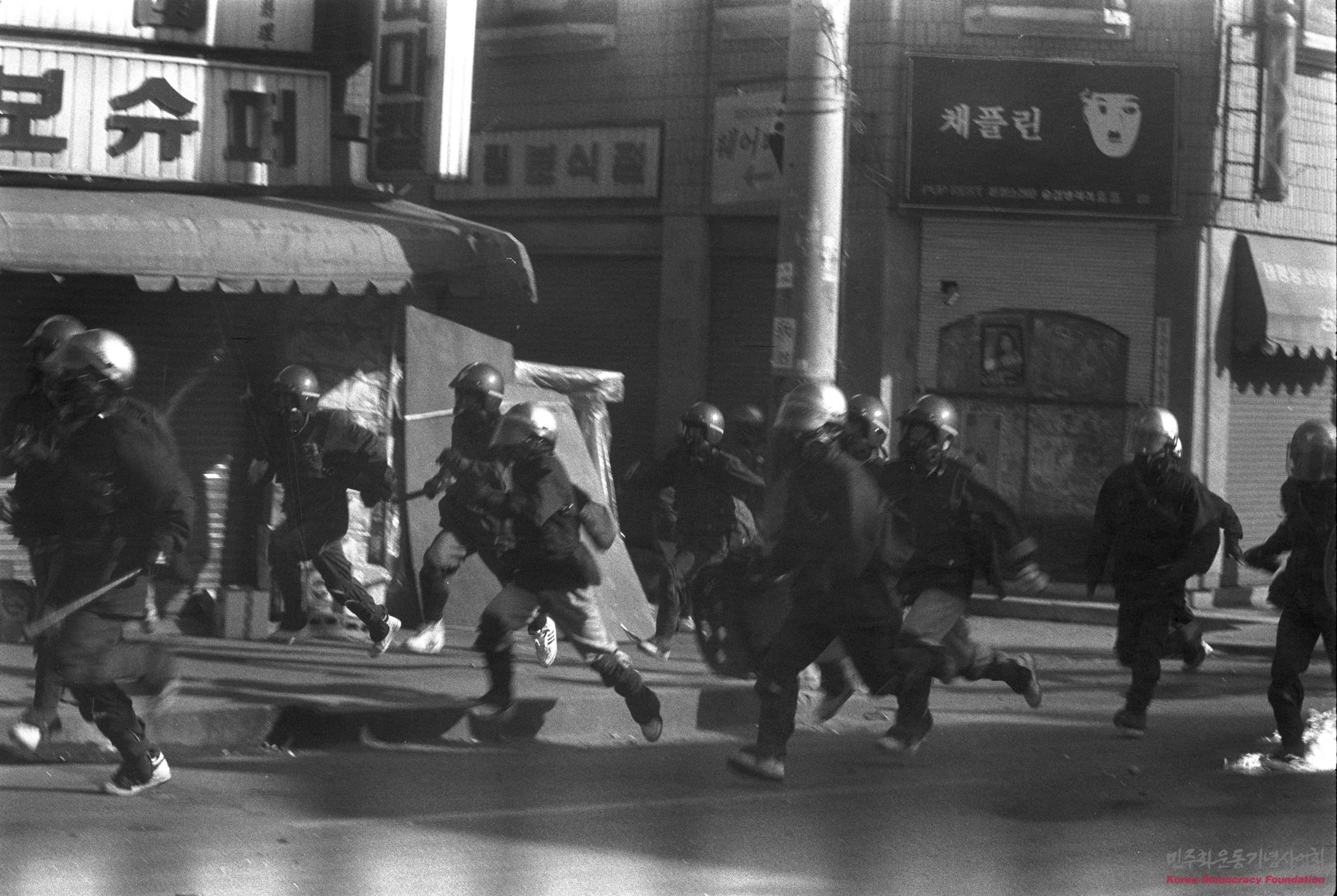 학생들을 진압하기 위해 달려오는 경찰