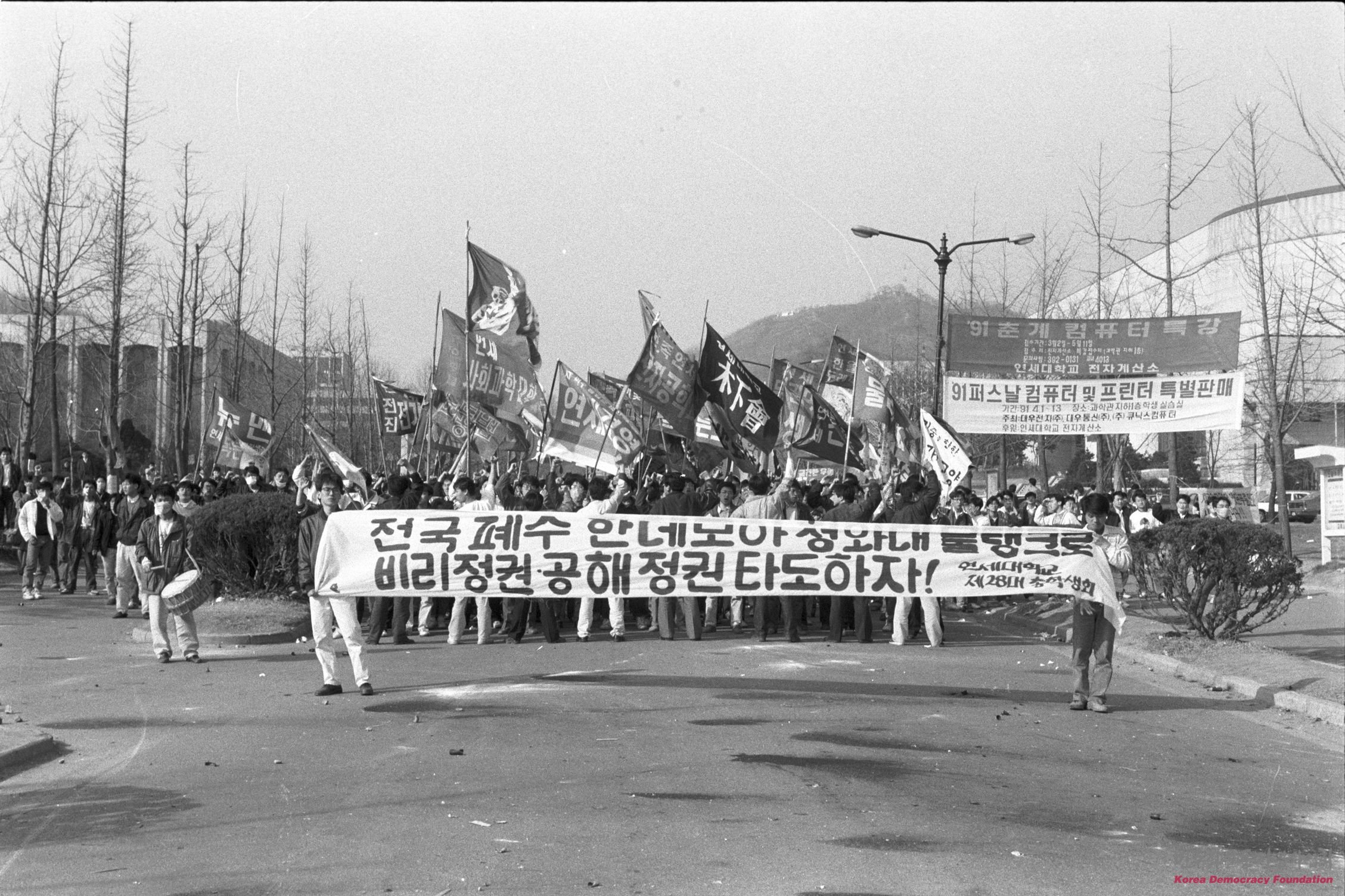 비리정권 타도가 적힌 현수막을 들고 대규모 학내시위를 전개하고 있는 연세대학교 총학생회